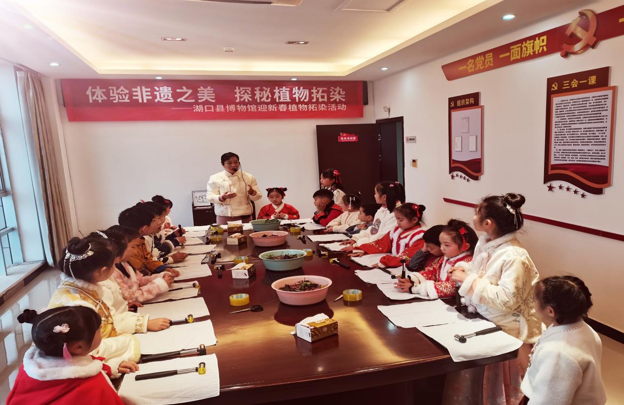 2024年1月25日由江西省博物馆主办的“本草精灵——江西部分珍稀植物标本微展览”全省巡展在湖口县博物馆开展。为了让广大群众了解江西丰富的植物资源,提高保护自然环境、珍惜自然资源的意识,也为了迎接新年的到来,湖口县博物馆配合展览通过网上公开召集二十名学生,在2024年1月31日开展了“体验非遗之美 探秘植物拓染”迎新春植物拓染活动。
