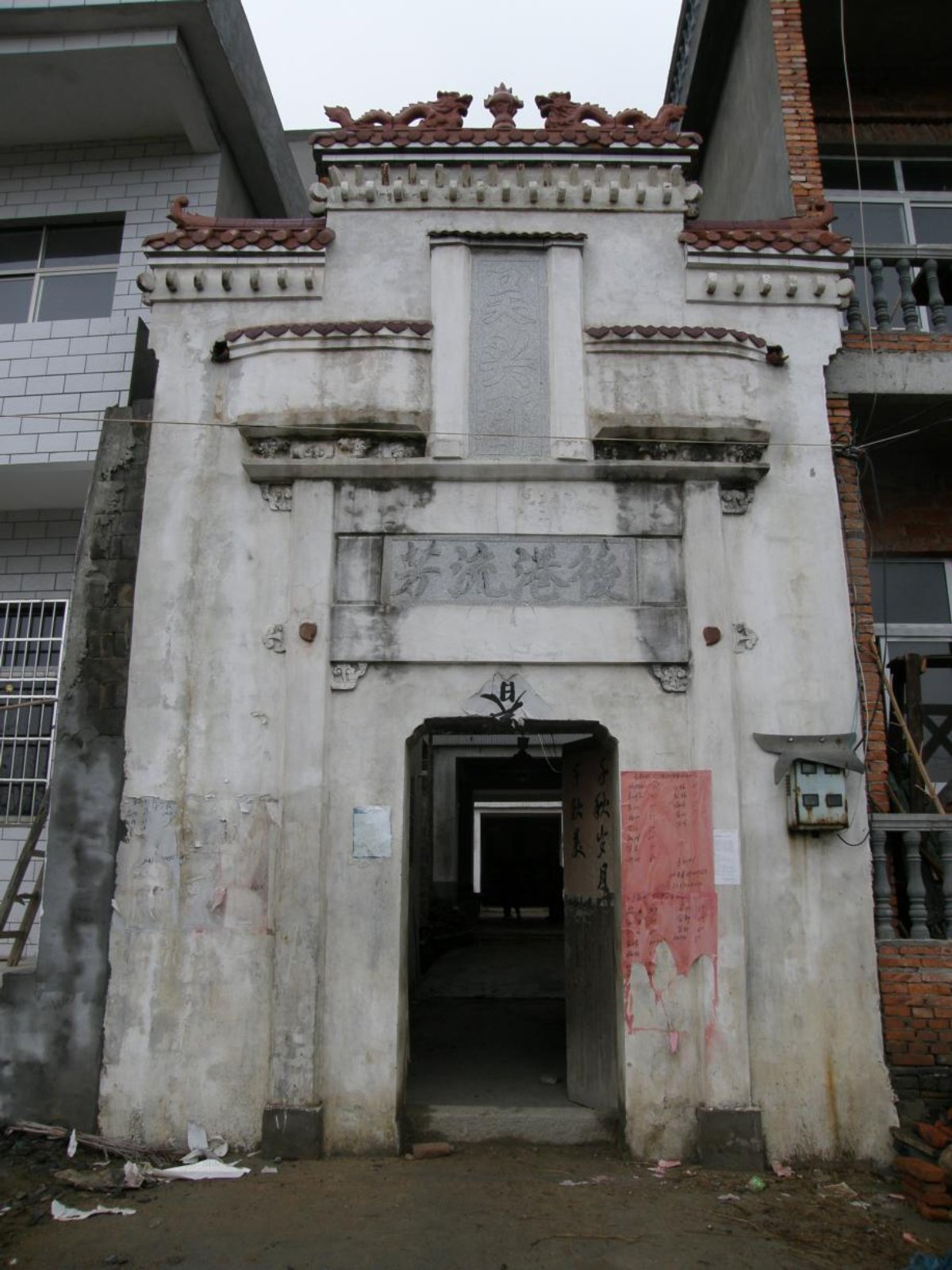 4.周玺湾祖堂:周玺湾祖堂位于流泗镇基垅村村委会周玺湾自然村中部,建于清代中晚期,原有上中下三进,1939年日本侵略军将中进烧毁,2003年将原建筑屋面土瓦换成琉璃瓦,墙体粉白出新。建筑坐西北向东南,深35.5米、宽8.45米、占地299.8平方米。尽管中进被毁,但其砖木构件仍保留了清代晚期祖堂规模和风貌。清乾隆进士、翰林偏修周厚辕为该村人,其墓葬在1956年修彭湖公路时毁。