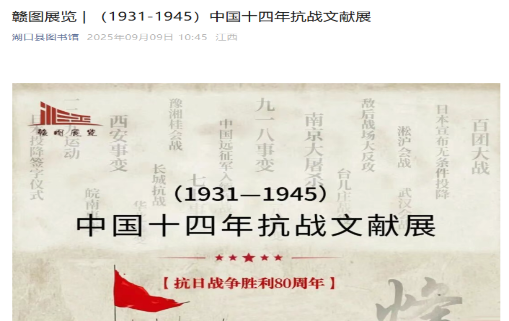 今年是中国人民抗日战争暨世界反法西斯战争胜利80周年,为铭记历史、缅怀先烈,弘扬伟大的爱国主义精神,湖口县图书馆在一楼大厅举办了《(1931-1945)中国十四年抗战文献展》主题展览。