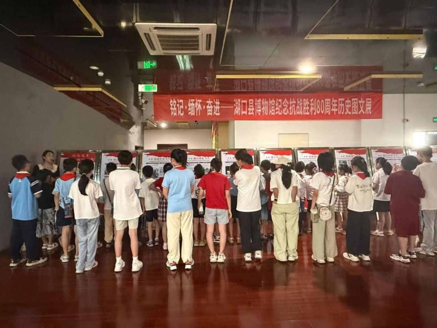 在“薪火永续”板块,讲解员讲述了湖口县在铭记抗战历史、致敬抗战英烈、弘扬抗战精神的当代传承——从各单位举办各种抗战相关展出展览活动,到进校园开展红色宣讲活动,再到去相关抗战遗址或纪念馆采风。用各自的行动践行着传承的重任。