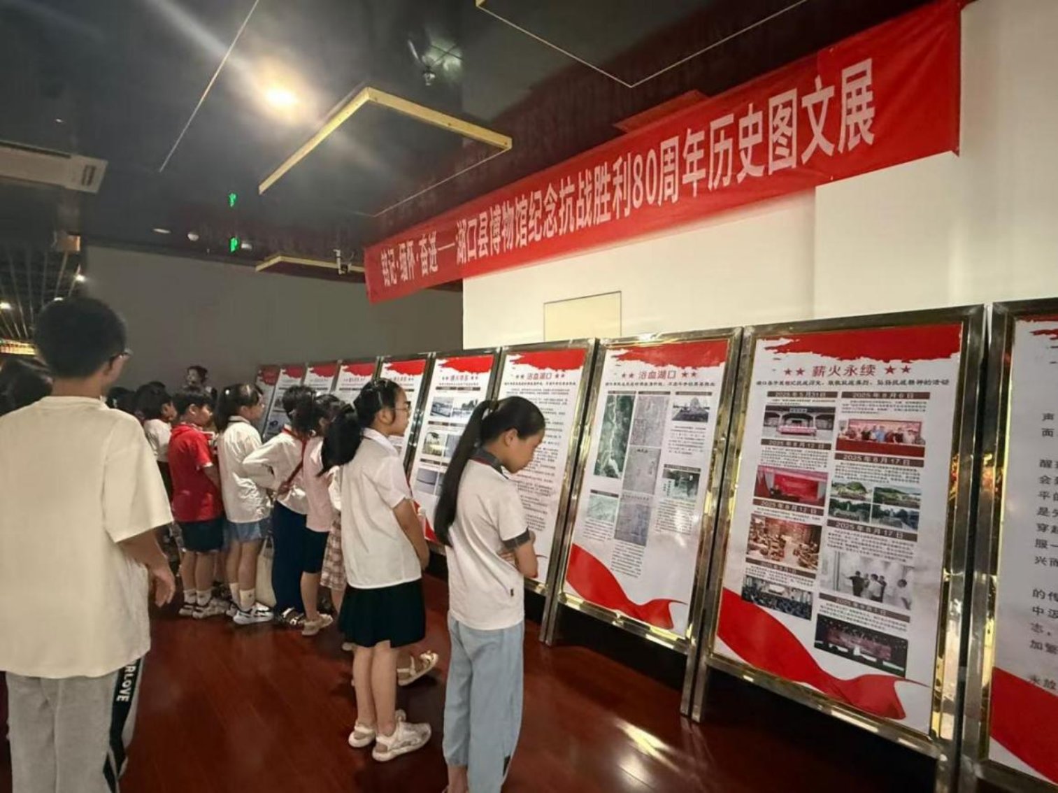 为纪念中国人民抗日战争暨世界反法西斯战争胜利80周年,2025年9月6日上午,博物馆三楼开展了以“铭记·缅怀·奋进”为主题的纪念抗战胜利80周年历史图文展。此次展览以“抗战长河”“烽火华东”“浴血湖口”“薪火永续”四大板块为脉络,通过带领参观者重温峥嵘岁月,传承红色精神。