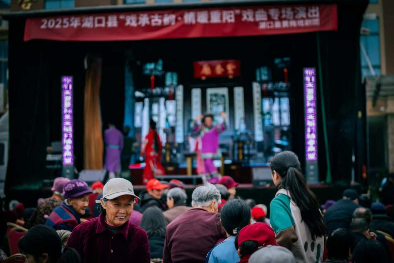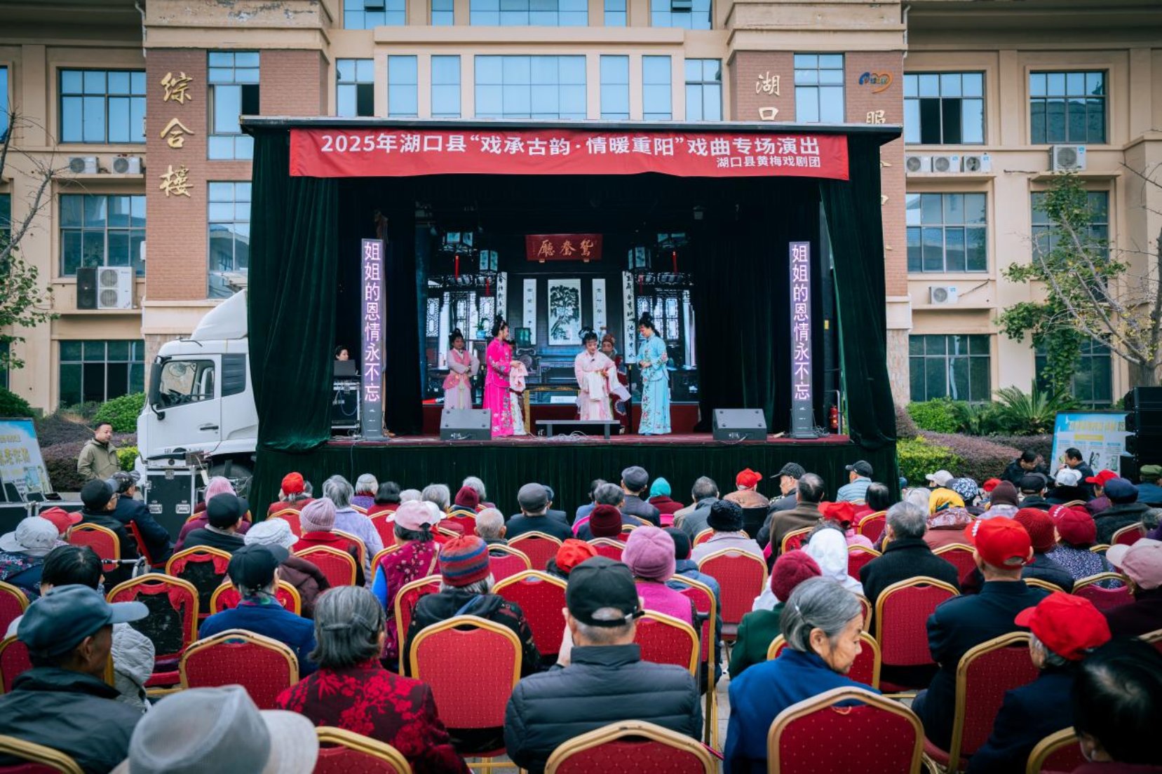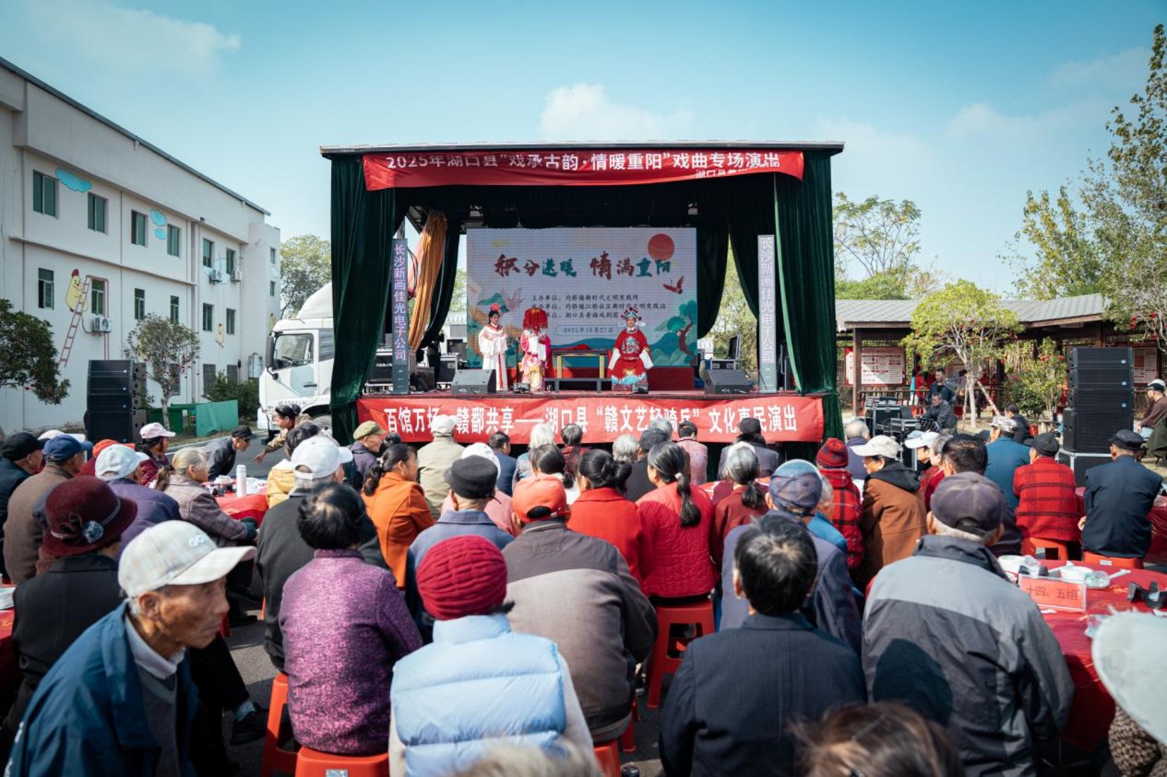 “锵锵锵——”熟悉的锣鼓声接连在湖口多地响起,瞬间点燃了重阳佳节的热烈氛围。10月26日至29日,由湖口县文化广电旅游局主办,县黄梅戏剧团、县文化馆承办的2025年湖口县“戏承古韵·情暖重阳”戏曲专场演出温情上演。