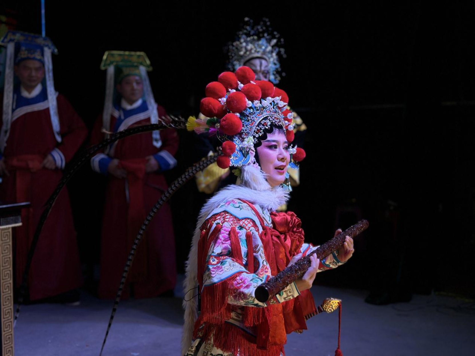 随后,演出队伍走进大垅乡联丰村,与舜德乡文化剧团携手,为乡亲们带来连续三日的精彩演出。悠扬的唱腔回荡在乡村舞台,吸引了众多村民驻足观赏。老戏迷沉浸其中,轻声跟唱,孩子们则被绚丽的戏服和生动的剧情深深吸引,灵动的大眼睛紧紧跟随着台上演员优美的身姿转动。两团联袂献演,不仅丰富了演出形式,更展现出本地戏曲队伍的蓬勃活力,让传统艺术在乡土间生根开花,广受百姓喜爱。