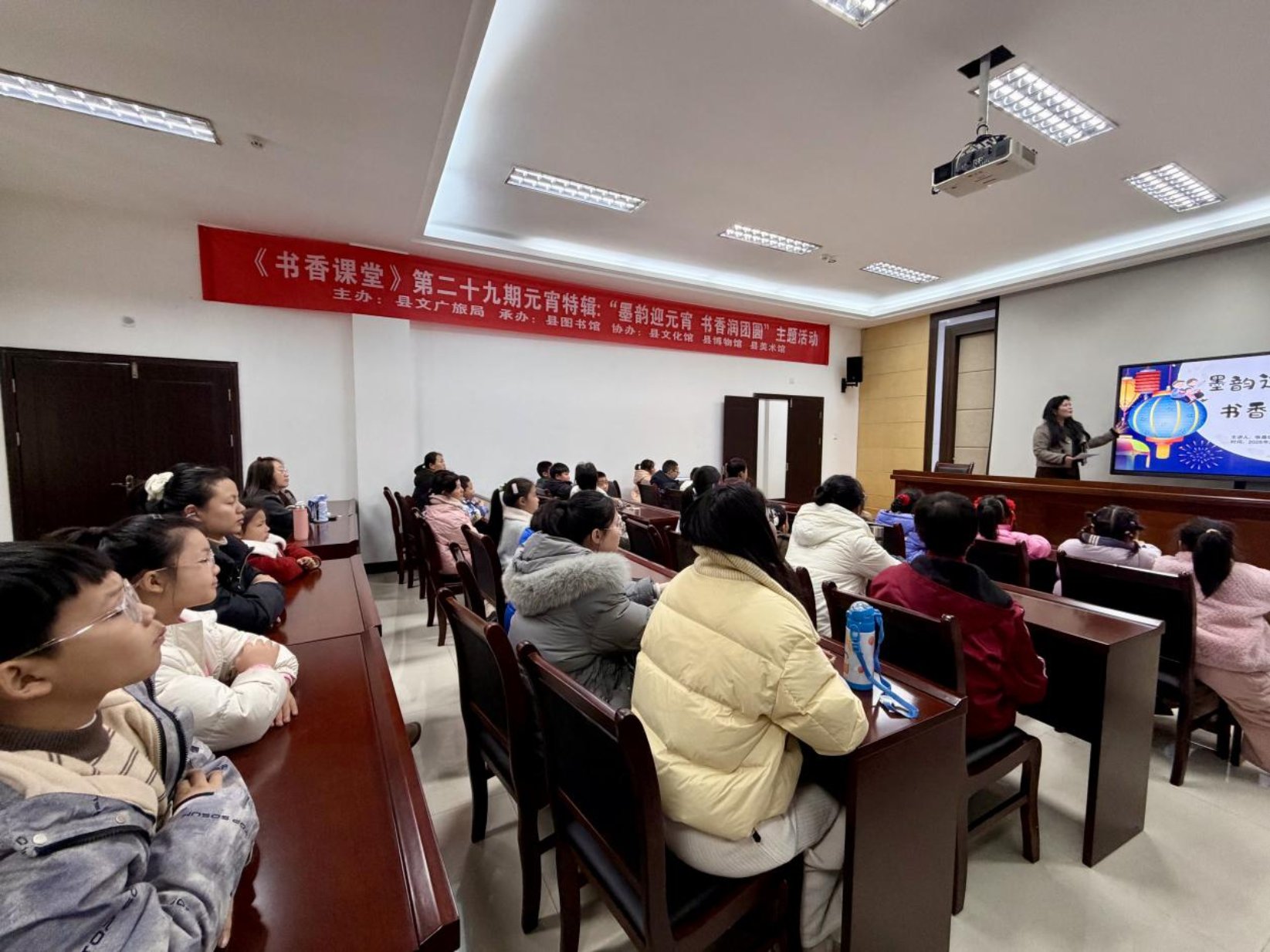 2026年2月28日,湖口县图书馆三楼报告厅内张灯结彩,热闹非凡。由县文广旅局主办、县图书馆承办的《书香课堂》元宵主题活动在此成功开展。活动以“墨韵迎元宵,书香润团圆”为主题,通过民俗讲解、猜灯谜、手工制作等环节,让近30组家庭在书香与民俗交融的氛围中,感受传统文化的魅力,度过了一个充满温情与新意的元宵佳节。