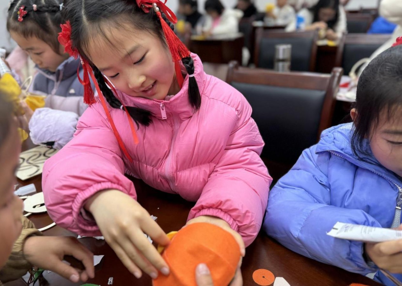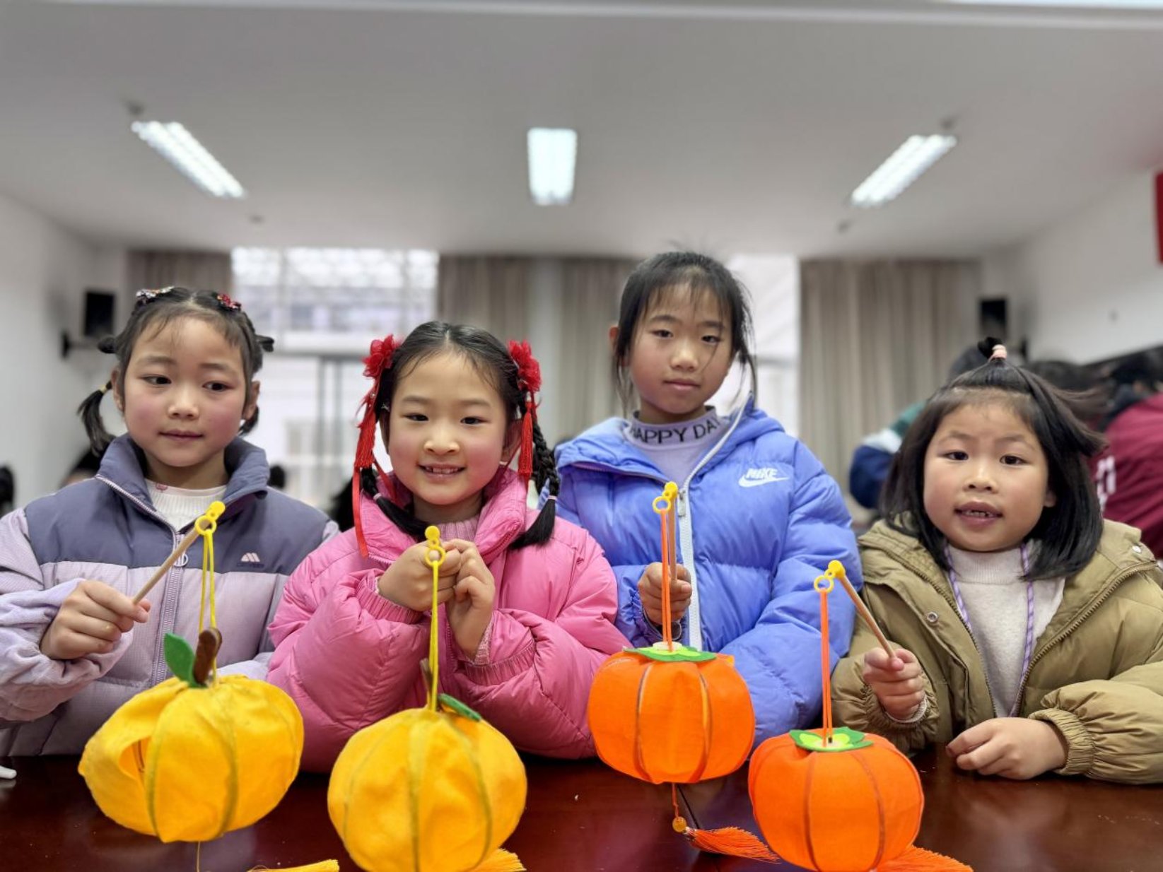 活动最引人注目的环节当数“做花灯,庆团圆”。在工作人员的指导下,家长与孩子们分工协作,制作出柿子、苹果、雪梨等创意花灯。小读者们手持亲手制作的花灯,在签名墙前留下笑脸与祝福。背景墙上“月圆人圆事事圆满,书香墨香声声入心”的对联,在彩色灯笼映照下熠熠生辉,成为这个元宵节最美的注脚。