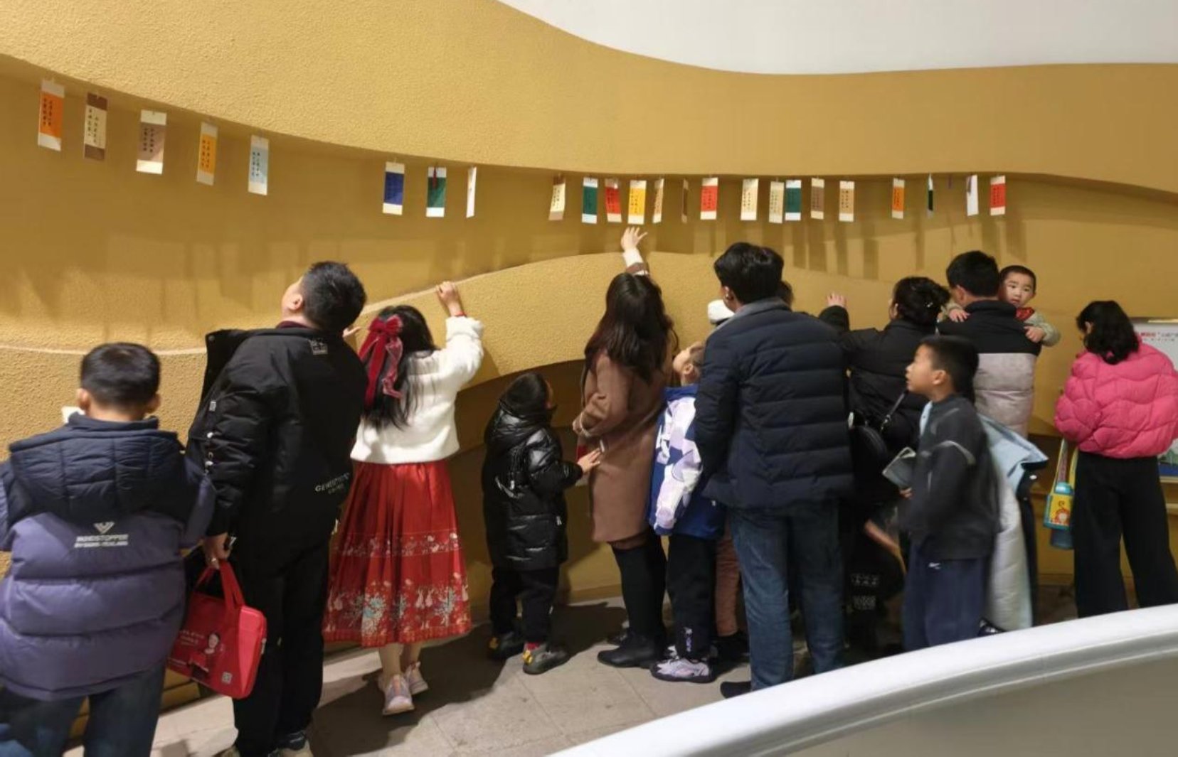 活动现场张灯结彩,喜庆氛围浓厚。在猜灯谜环节,精心设计的灯谜条错落悬挂于馆内墙面,内容涵盖文物知识、民俗典故、趣味文字等,兼具知识性与趣味性。家长与孩子围站灯谜墙前,或低头沉思或热烈讨论,在解谜的过程中既增长了见识,也增进了亲子间的互动交流,现场不时传来猜出谜底的欢呼声。