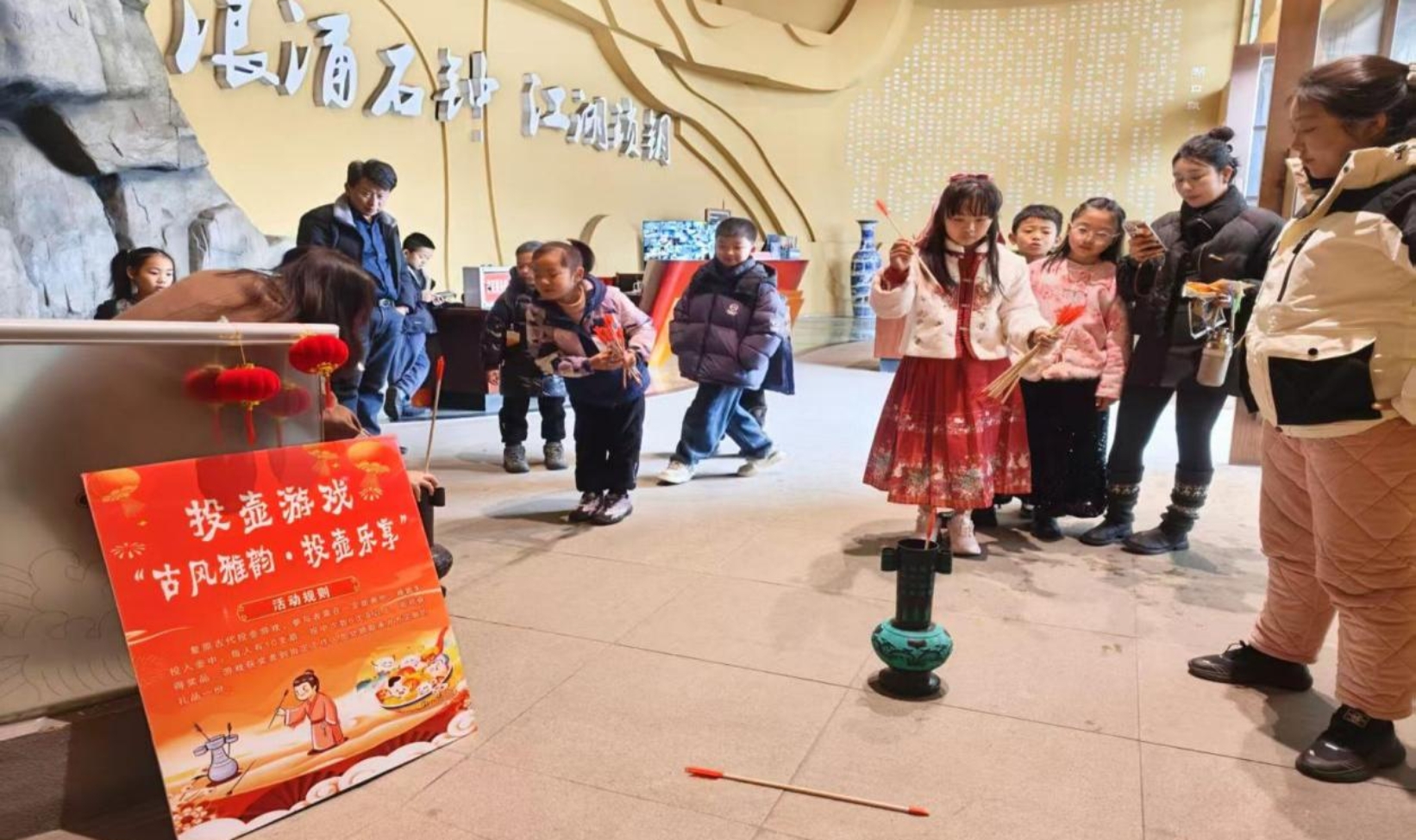 移步至投壶体验区,“古风雅韵·投壶乐享”的活动牌格外醒目。孩子们手持箭支,在工作人员的指导下,屏气凝神瞄准壶口,体验这项源自古代的礼仪游戏。投壶不仅考验手眼协调能力,更传递着古人“礼”的文化内涵,孩子们在一次次投掷中感受传统游戏的乐趣,也在欢声笑语中领略中华礼仪的魅力。