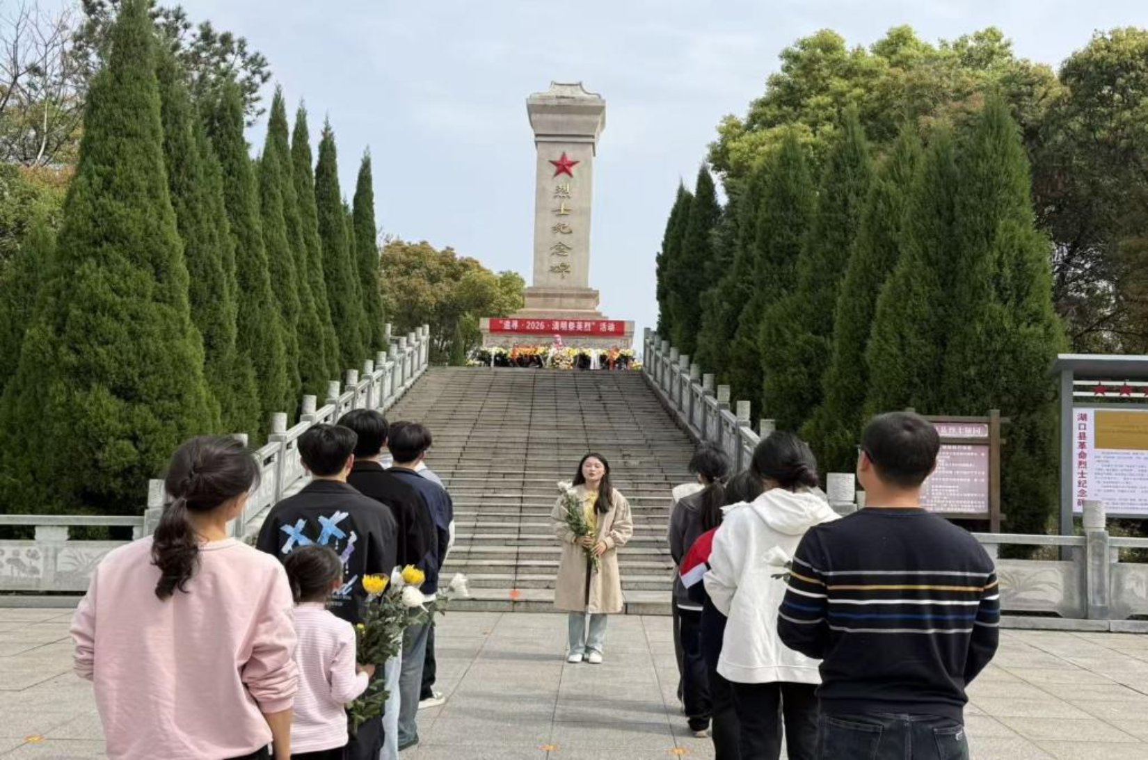 活动在庄重肃穆的氛围中拉开序幕。全体师生整齐列队,神情肃穆,向革命先烈默哀致敬,表达深切哀思。学生们手捧鲜花,缓步走向革命烈士纪念碑,将鲜花敬献于碑前,以最朴素、最诚挚的方式缅怀先烈、致敬英雄。县美术馆王金现场讲述了湖口县本地的革命历史及邹觉民、周庚年、王文凤等烈士的感人事迹。在革命先烈的精神感召下,同学们面向熠熠生辉的团旗庄严宣誓。这既是对湖口革命烈士的崇高致敬,更是新时代青年立志成才、报效祖国的青春担当。