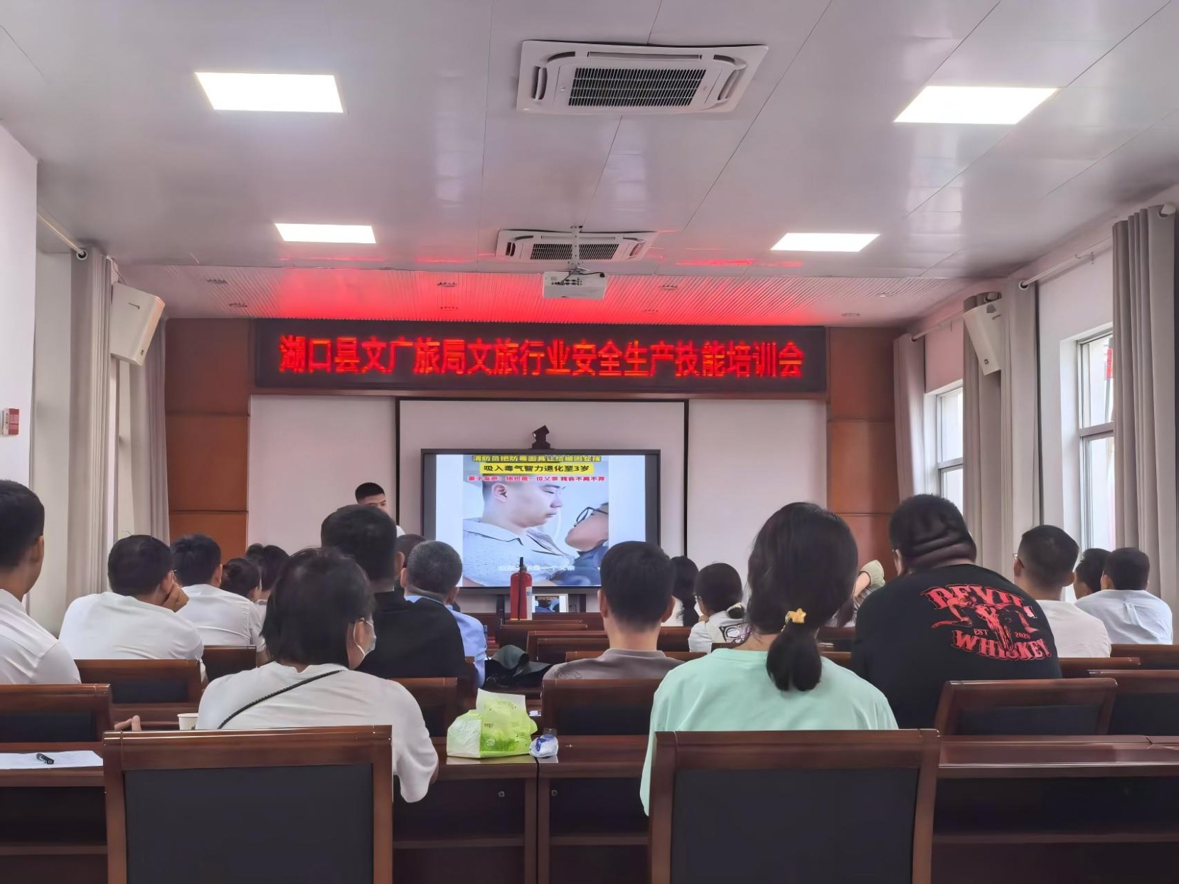 为进一步加强旅游行业的消防安全工作,提高文旅行业相关从业人员的消防安全意识和应急处置能力,2025年6月23日,湖口县文广旅局组织开展文旅行业安全生产技能培训会。本次会议邀请专业消防安全领域老师授课,文旅相关行业代表30余人参会。
