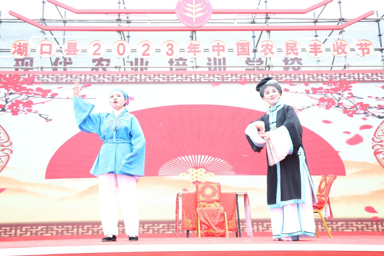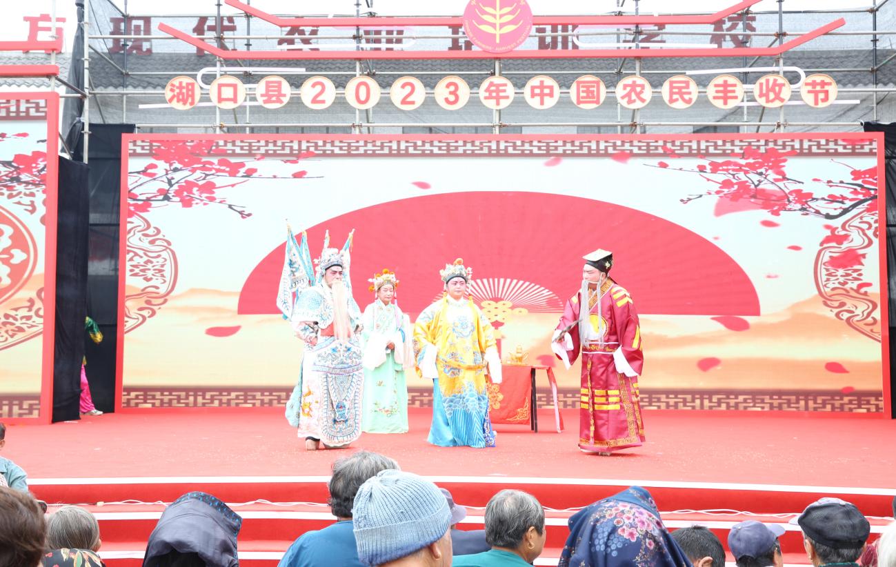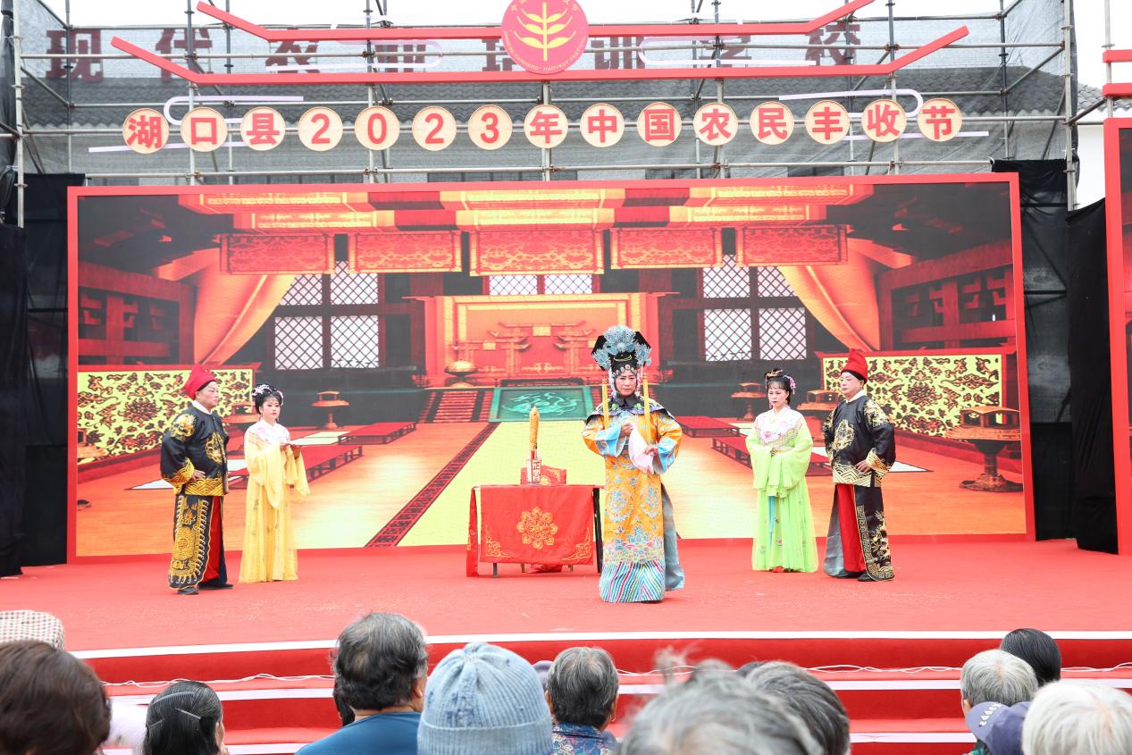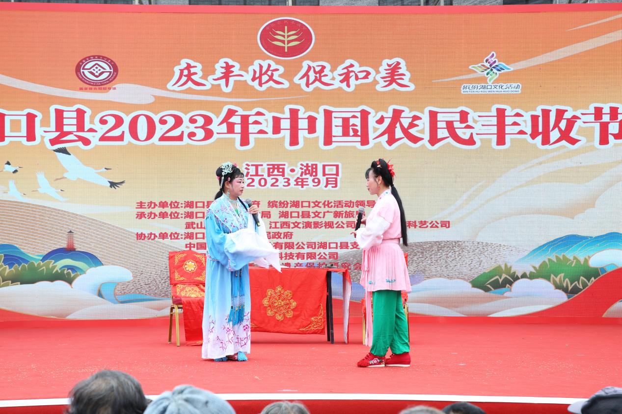 9月24日,由湖口县人民政府、湖口县农业农村局、湖口县文广新旅局等单位在湖口县武山镇联合举办的“农民丰收节”活动圆满开展。在本次农民丰收节活动中湖口县非遗中心组织石钟青阳腔剧团、湖口双馨弹腔剧团、石志明采茶戏剧团等10个非遗剧团开展了“送戏下乡”活动,展演了《锦绣湖口》、《讨令》、《送绫罗》等经典剧目。剧团演员精彩的演绎,赢得台下观众纷纷鼓掌喝彩。本次送戏下乡活动通过戏剧方式充分展现农业农村发展新面貌,展示了新时代农民新风采,营造城乡共庆共祝共享丰收的节日氛围。