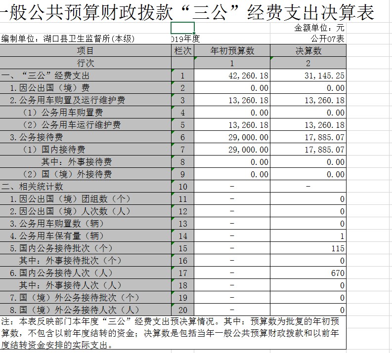 (三)公务用车购置及运行维护费支出 1.3万元,其中公务用车购置年初预算数为0 万元,决算数为 0万元,完成年初预算的100%,决算数较2018年无改变,公务用车运行维护费支出年初预算数为1.3 万元,决算数为1.3万元,完成年初预算的100%,决算数较2018年减少0.3万元,下降19 %。决算数较年初预算数减少的主要原因是:减少公车使用……。