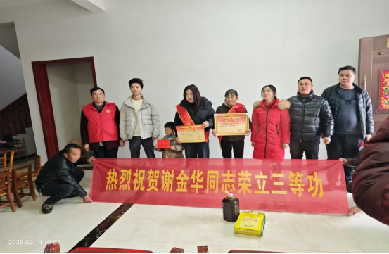 2025年1月14日湖口县退役军人事务局和武山镇退役军人服务站及村服务站一行人来到立功军人谢金华家中,为其送上三等功喜报与奖励金,场面喜庆而热烈。