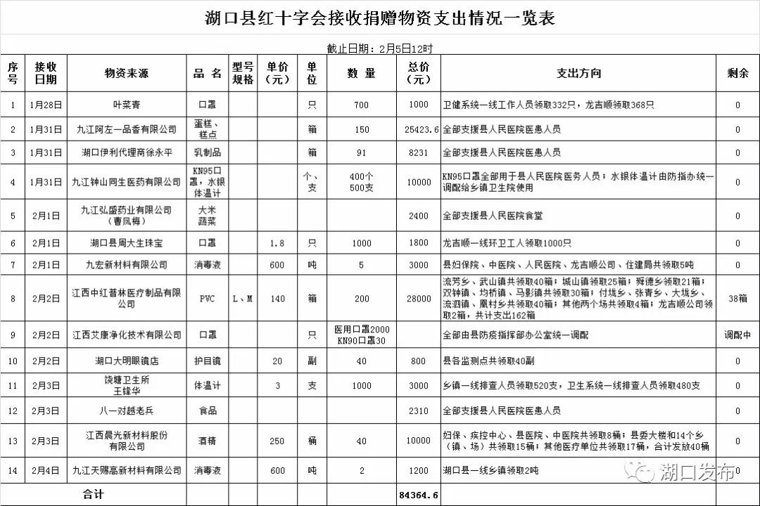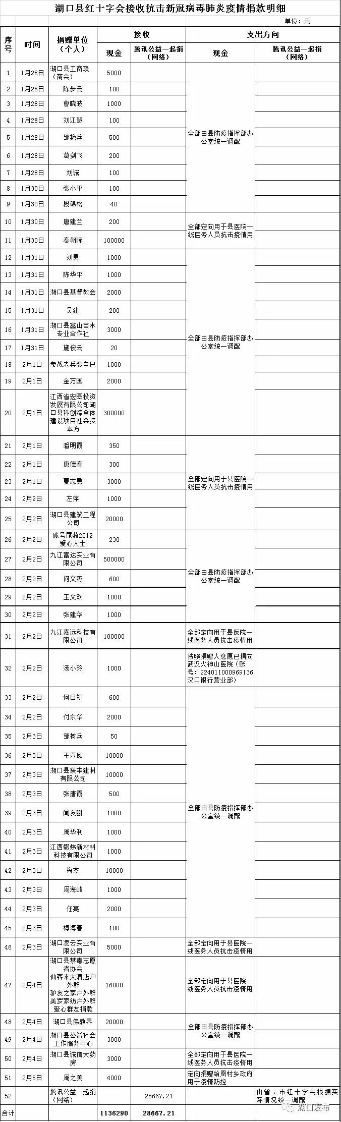 截至2020年2月5日12时,湖口县红十字会接收抗击新冠病毒肺炎疫情捐款1136290元,捐物84364.6元,腾讯公益一起捐28667.21元。具体如下: