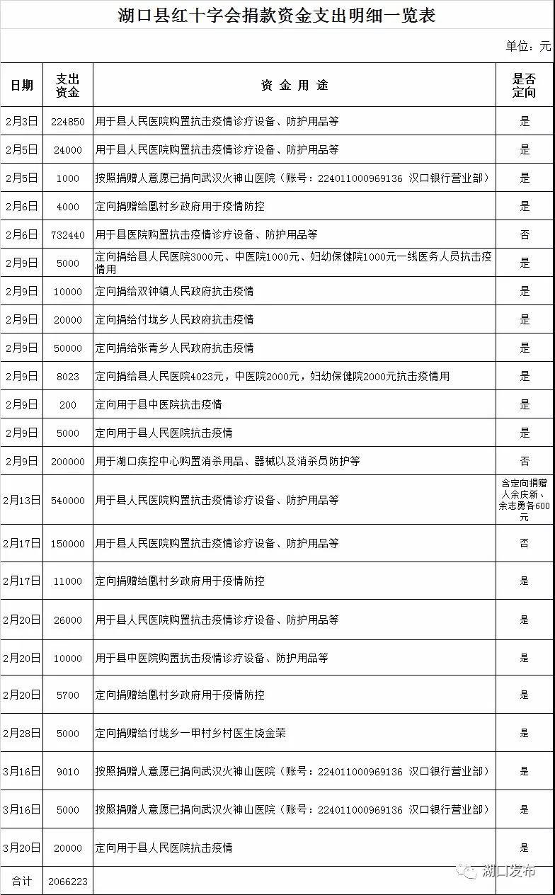 截至2020年4月1日12时,湖口县红十字会接收抗击新冠病毒肺炎疫情捐款2446761.85元(含腾讯一起捐28667.21元),其中支出2066223元,余下380538.85元由防指办统一调配;捐物2000829.6元人民币、4025美元;腾讯公益一起捐(明细查询湖口江湖风云APP)。具体如下:
