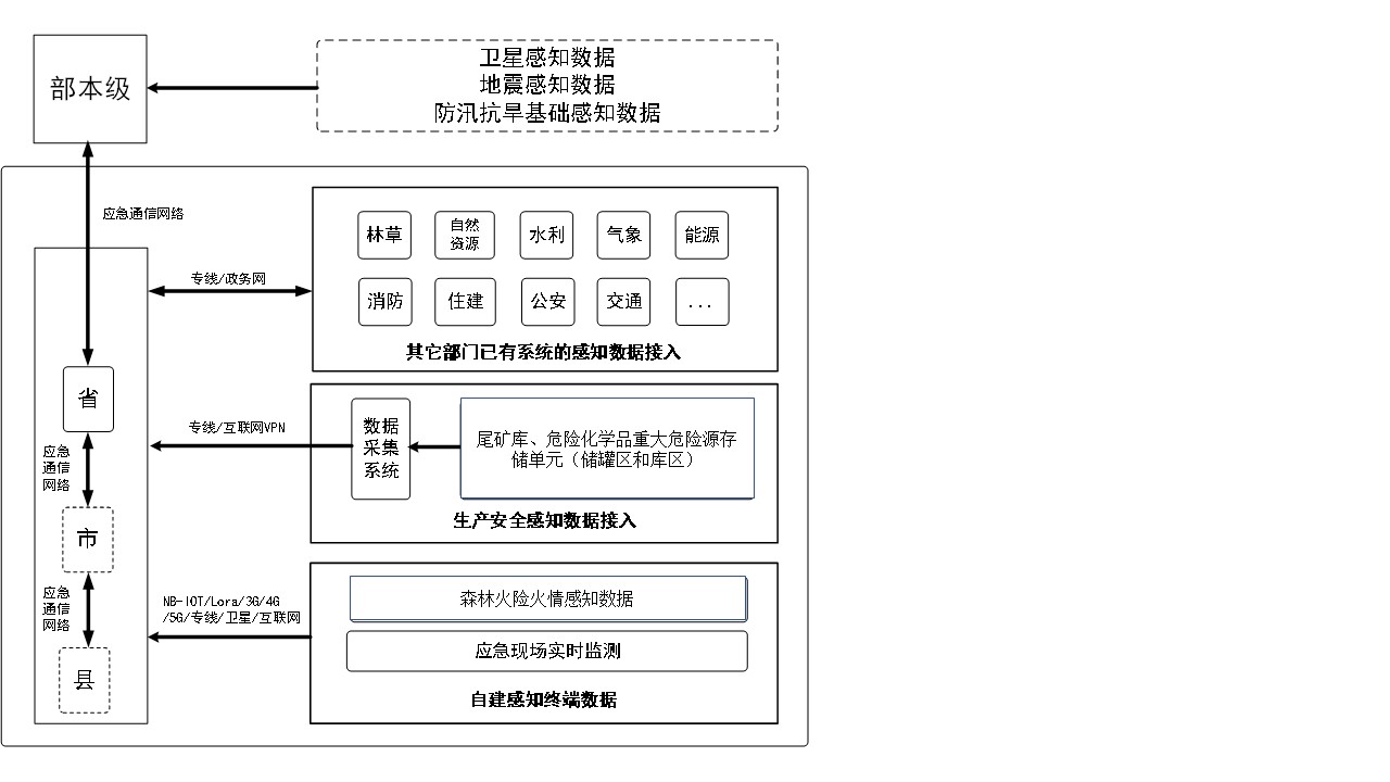感知层,利用物联网、射频识别等技术,实现生产安全、自然灾害类等感知数据的接入,为监测预警等业务应用的按需统一资源调配提供支撑;