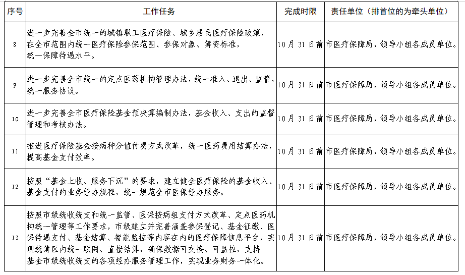 2021年1月1日起,在全市实行职工医疗保险(包括基本医疗保险和生育保险、大病保险、机关事业单位人员医疗补助,不包括离休干部医药费单独统筹)和城乡居民医疗保险(包括基本医疗保险、大病保险)基金市级统收统支,统一核算,统一管理。建立“六统一”(覆盖范围统一、筹资政策统一、待遇水平统一、基金管理统一、经办流程统一、信息系统统一)的医疗保险市级统筹制度。在全面实施基本医疗保险市级统筹的基础上,探索推进市级以下医疗保障部门垂直管理。