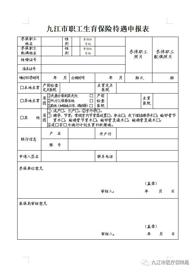 2、津贴待遇:填写《九江市职工生育保险待遇申报表》(见附件),携带生育服务卡复印件、结婚证复印件、出院费用结算联、出院记录、门诊发票(600元)等相关材料在当地医保经办机构申报。