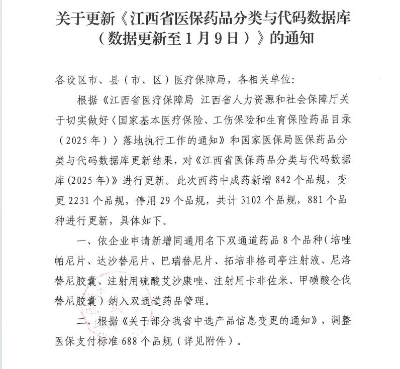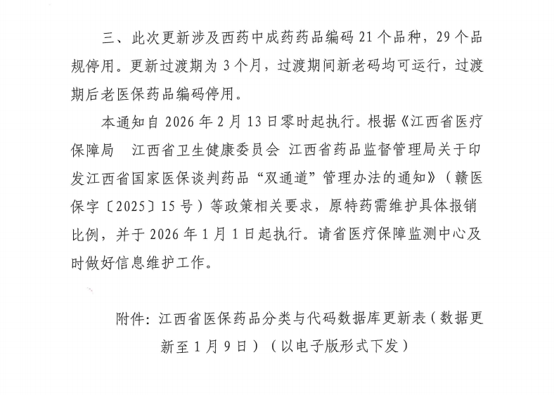 江西省医保药品分类与代码数据库更新表(数据更新至2026年1月9日)(以电子版形式下发)