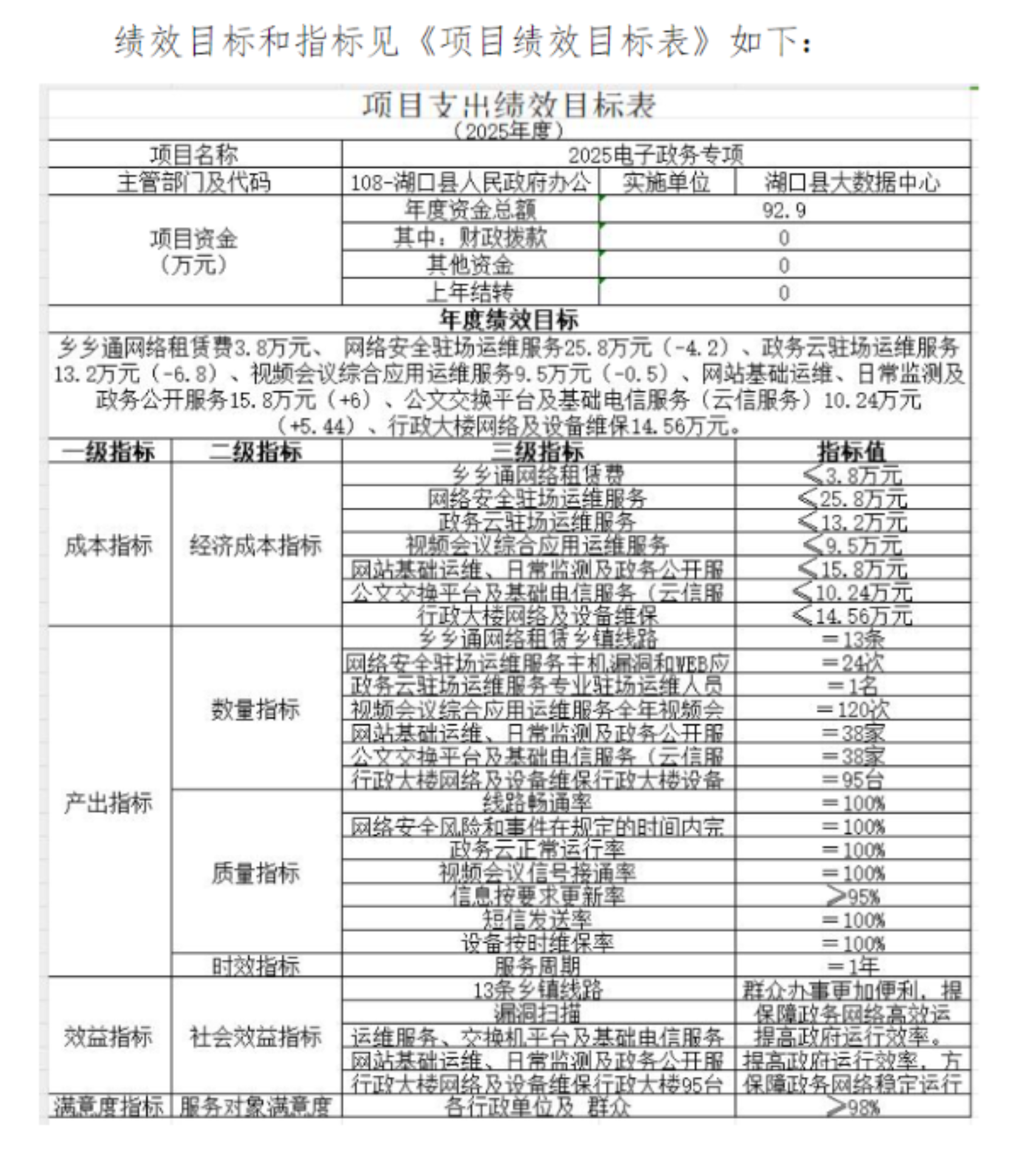 1 ) 项 目 概 述 根 据 上 级 要 求 和 县 委 、 县 政 府 工 作 安 排 , 2 0 2 4 年 度 我 中 心 牵 头 组 织 实 施 电 子 政 务 专 项 项 目 的 运 维 服 务 购 买 工 作 , 其 中 县 乡 乡 通 网 络 租 赁 项 目 , 负 责 提 供 政 务 网 县 至 乡 镇 3 8 条 1 0 0 M I P R A N 线 路 、 通 信 设 施 进 行 运 维 服 务 ; 网 络 安 全 建 设 项 目 , 负 责 针 对 县 网 络 安 全 建 设 工 作 进 行 驻 场 运 维 服 务 ; 政 务 云 建 设 项 目 , 负 责 对 县 政 务 云 进 行 日 常 运 维 服 务 ; 视 频 会 议 综 合 应 用 项 目 , 负 责 对 县 政 府 视 频 会 议 系 统 进 行 驻 场 运 维 服 务 ; 政 府 网 站 及 政 务 公 开 建 设 项 目 , 负 责 对 县 政 府 网 站 及 县 政 务 公 开 工 作 进 行 运 维 服 务 ; 公 文 交 换 平 台 及 行 政 服 务 大 厅 项 目 , 分 别 负 责 对 我 县 公 文 交 换 平 台 和 政 务 服 务 平 台 提 供 短 信 服 务 ; 县 政 府 网 站 日 常 监 测 平 台 项 目 , 负 责 对 县 政 务 网 站 提 供 普 查 新 指 标 检 测 和 网 站 错 别 字 检 测 等 运 维 服 务 ; 行 政 大 楼 网 络 及 设 备 项 目 , 负 责 对 县 政 府 大 楼 的 政 务 网 及 电 子 设 备 进 行 驻 场 运 维 服 务 。