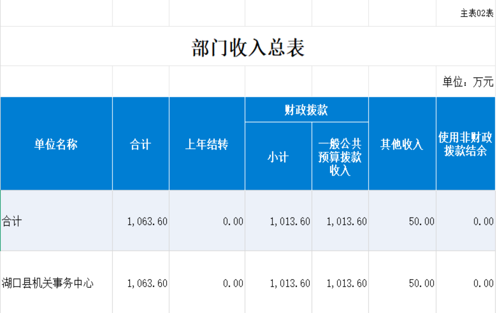 2026年湖口县机关事务中心收入预算总额为1063.6万元,较上年预算安排减少1.6万元; 财政拨款收入1013.6万元,较上年预算安排减少1.6万元;教育收费资金收入0万元,较上年预算安排增加0万元;事业单位经营收入0万元,较上年预算安排增加0万元;其他收入50万元,较上年预算安排增加0万元;国库集中支付网上结转0万元,较上年预算安排增加0万元。