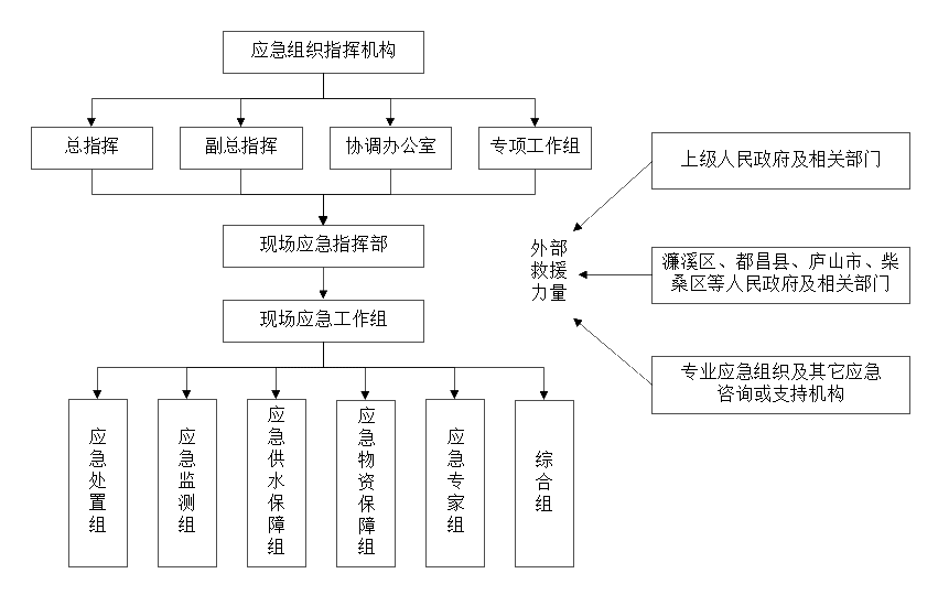 湖口县县级集中式饮用水水源地突发环境事件应急组织指挥体系由应急组织指挥机构、现场应急指挥部、现场应急工作组、外部救援力量等构成。