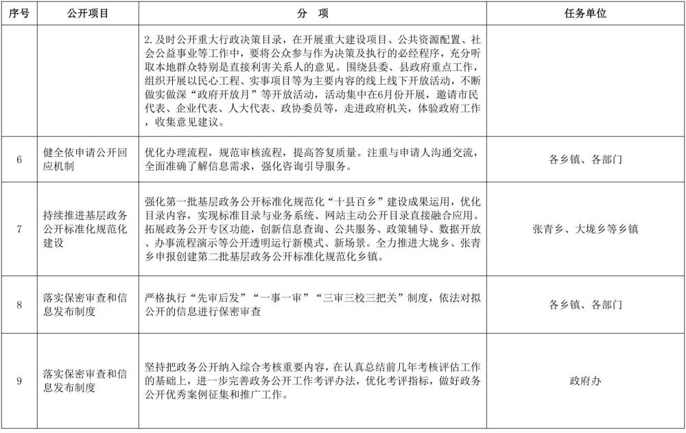 八、持续推进基层政务公开标准化规范化建设。创新线下公开模式,推动政民互动多元化、常态化。进一步拓展政务公开专区功能,不断创新信息查询、公共服务、政策辅导、数据开放、办事流程演示等公开透明运行新模式、新场景,满足群众信息需求。强化第一批基层政务公开标准化规范化“十县百乡”建设成果运用,全力推进大垅乡、张青乡申报创建第二批基层政务公开标准化规范化乡镇。优化调整政务公开标准目录,推动标准目录与业务系统、网站主动公开目录直接融合应用,打造可复制可推广的政务公开样板。