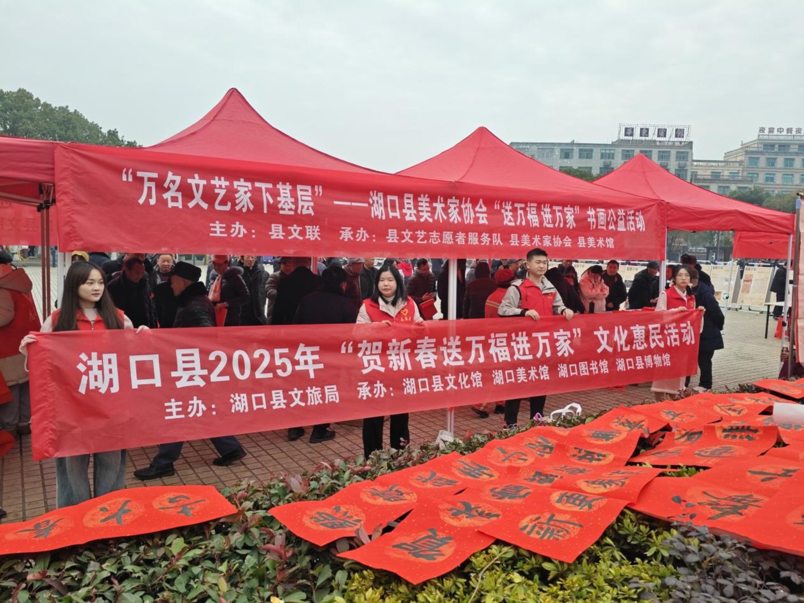 1月22日由湖口县文广旅局主办,县文化馆、县博物馆、县图书馆、县美术馆共同承办的“贺新春送万福进万家”文化惠民活动在鄱阳湖大市场开展。