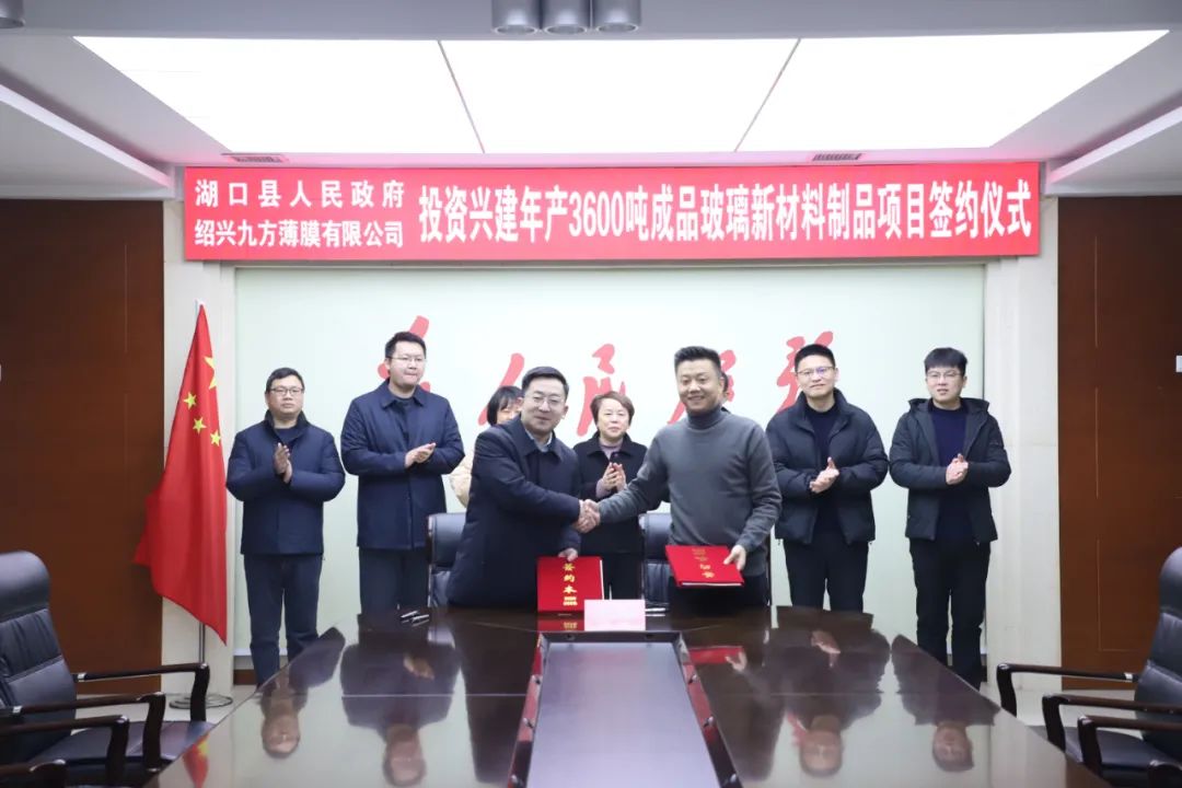 1月15日,湖口县人民政府与绍兴九方薄膜有限公司举行投资兴建年产3600吨成品玻璃新材料制品项目签约仪式。县人大常委会副主任、县总工会主席梅慧菊,副县长马达及相关单位负责同志出席签约仪式。