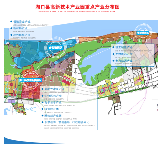 湖口高新技术产业园位于中心城区东部,整体建设沿长江而下,向腹地纵深推进开发,总规划面积 40平方公里,开发建成19. 2平方公里,已形成金砂湾园区、银砂湾园区和海山科技创新实验区“一园三 区”分布格局。整个园区水电路、管网、港口码头、污水处理等基础设施完善,学校、医院、金融、物 流、商务、休闲等公共服务齐备。
