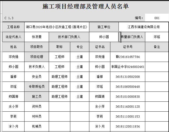 内容:项目经理、预算员、施工员、技术员、测量员、材料采购员、材