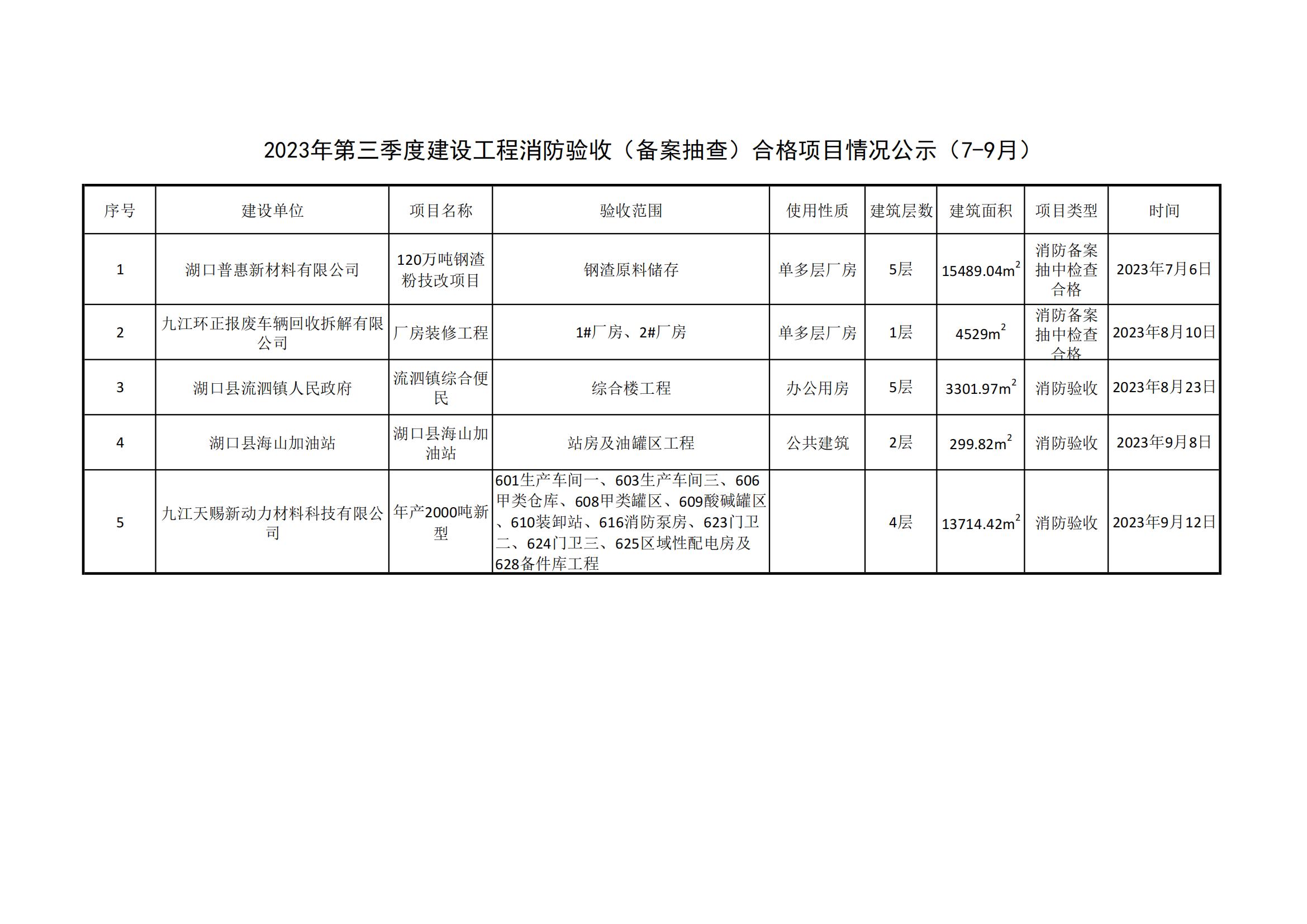2023年度建设工程消防验收(备案抽查)合格项目情况公示(7-9月)