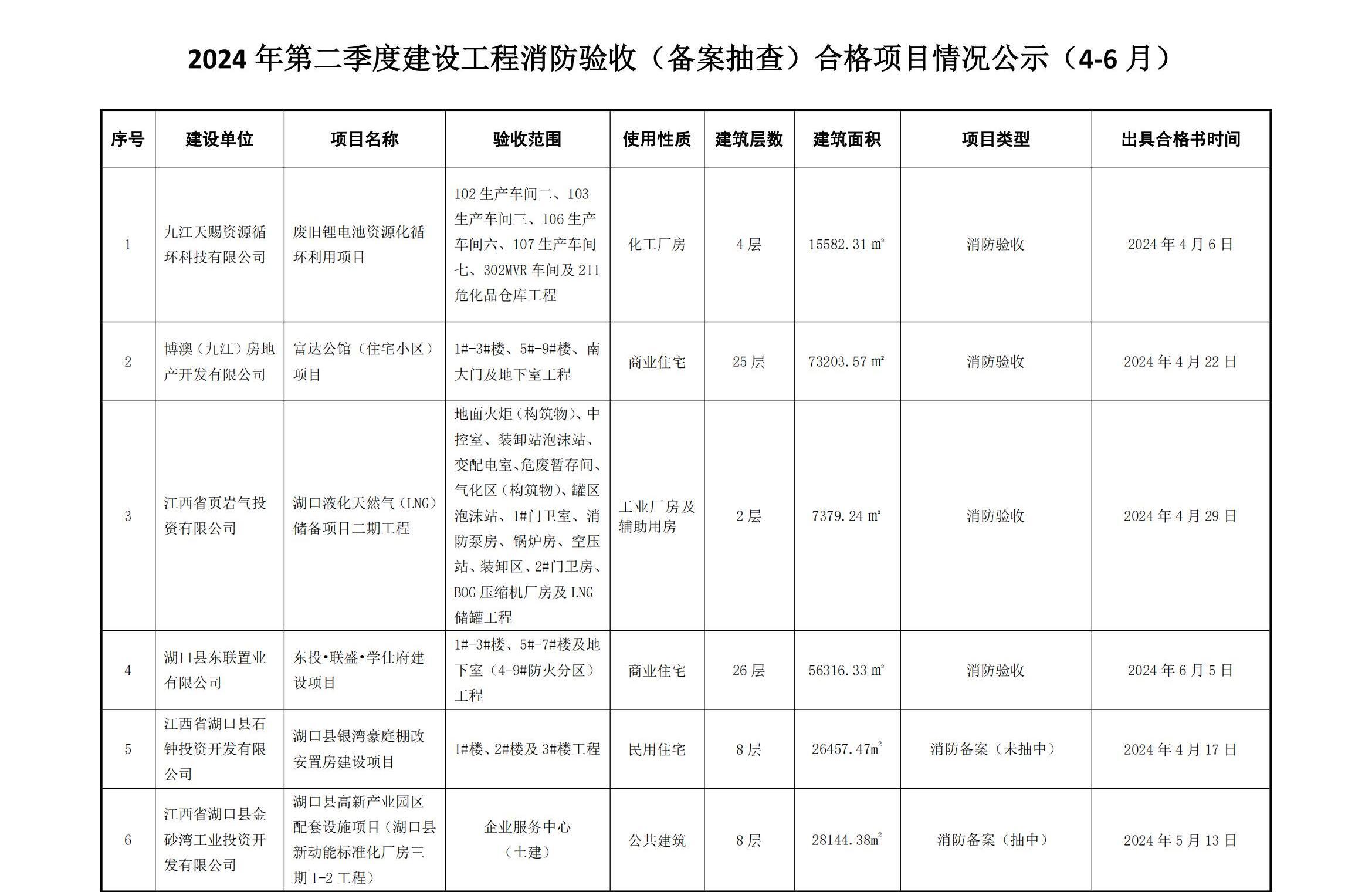 2024年第二季度建设工程消防验收(备案抽查)合格项目情况公示(4-6月)