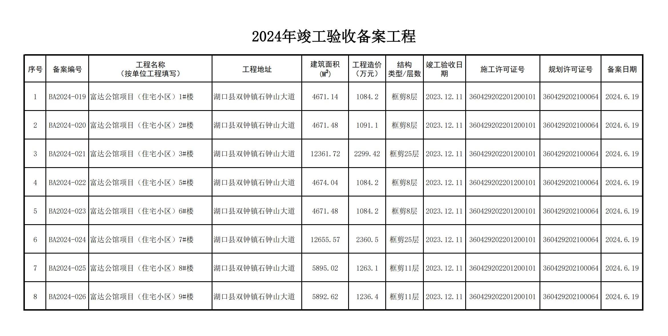 湖口县住房和城乡建设局2024年竣工验收备案工程情况(2024年4-6月)