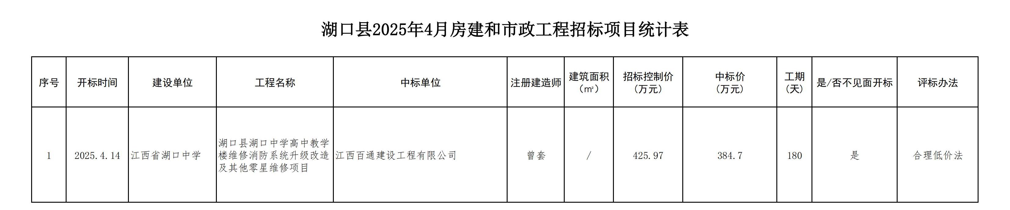 湖口县2025年4月房建和市政工程招标项目统计表