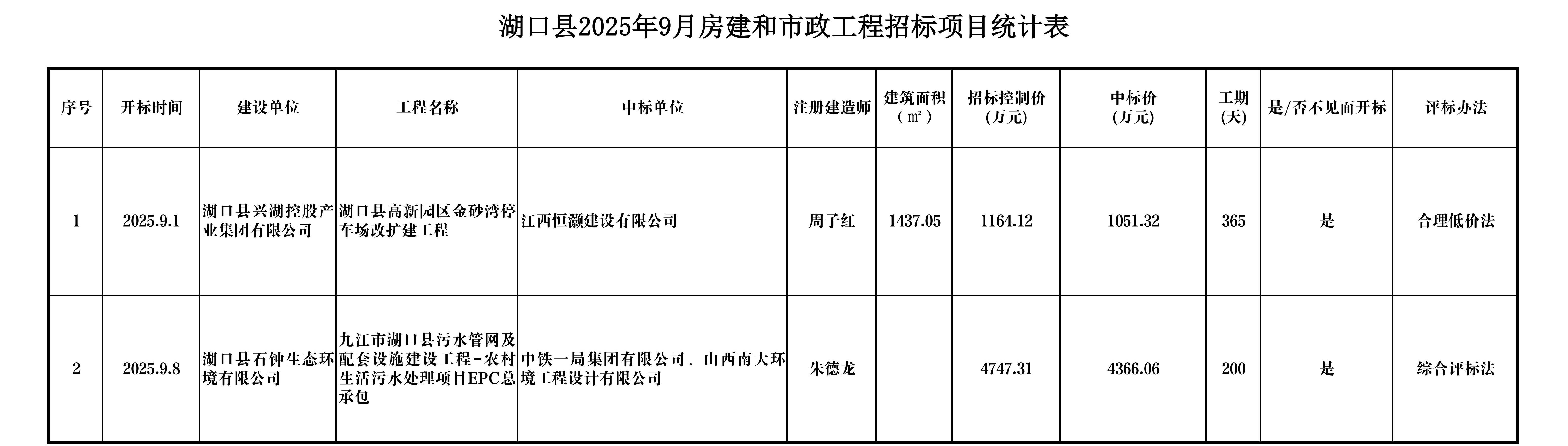 湖口县2025年9月房建和市政工程招标项目统计表