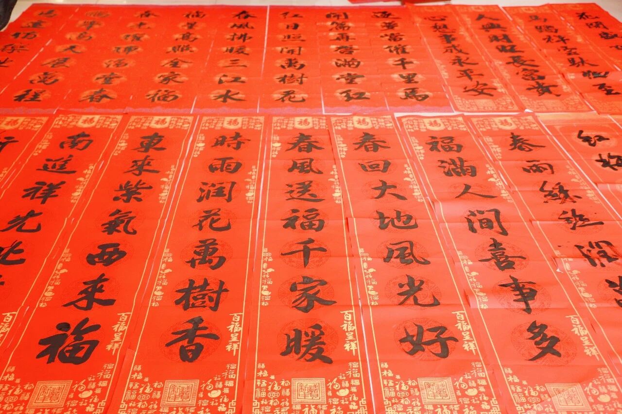 活动现场暖意融融、热闹非凡,大红宣纸整齐铺展,墨香与欢声笑语交织成冬日里最动人的图景。来自县老年大学的书法爱好者凝神挥毫,一幅幅寓意吉祥的春联跃然纸上。“春回大地千山秀,福降人间万户欢”“国泰民安承盛世,风调雨顺兆丰年”等经典佳句,或是遒劲有力、大气磅礴,或是娟秀灵动、温润雅致,既饱含着对新春的期盼,也承载着对乡亲们美好生活的祝福。红纸翻飞间,一个个喜庆的“福”字落笔成形,承载着满满的年味与暖意。乡亲们围站在书桌旁,静心观赏书法创作,脸上洋溢着幸福的笑容,纷纷称赞:“手写的春联才有年味儿,这是最实在的新春祝福。”