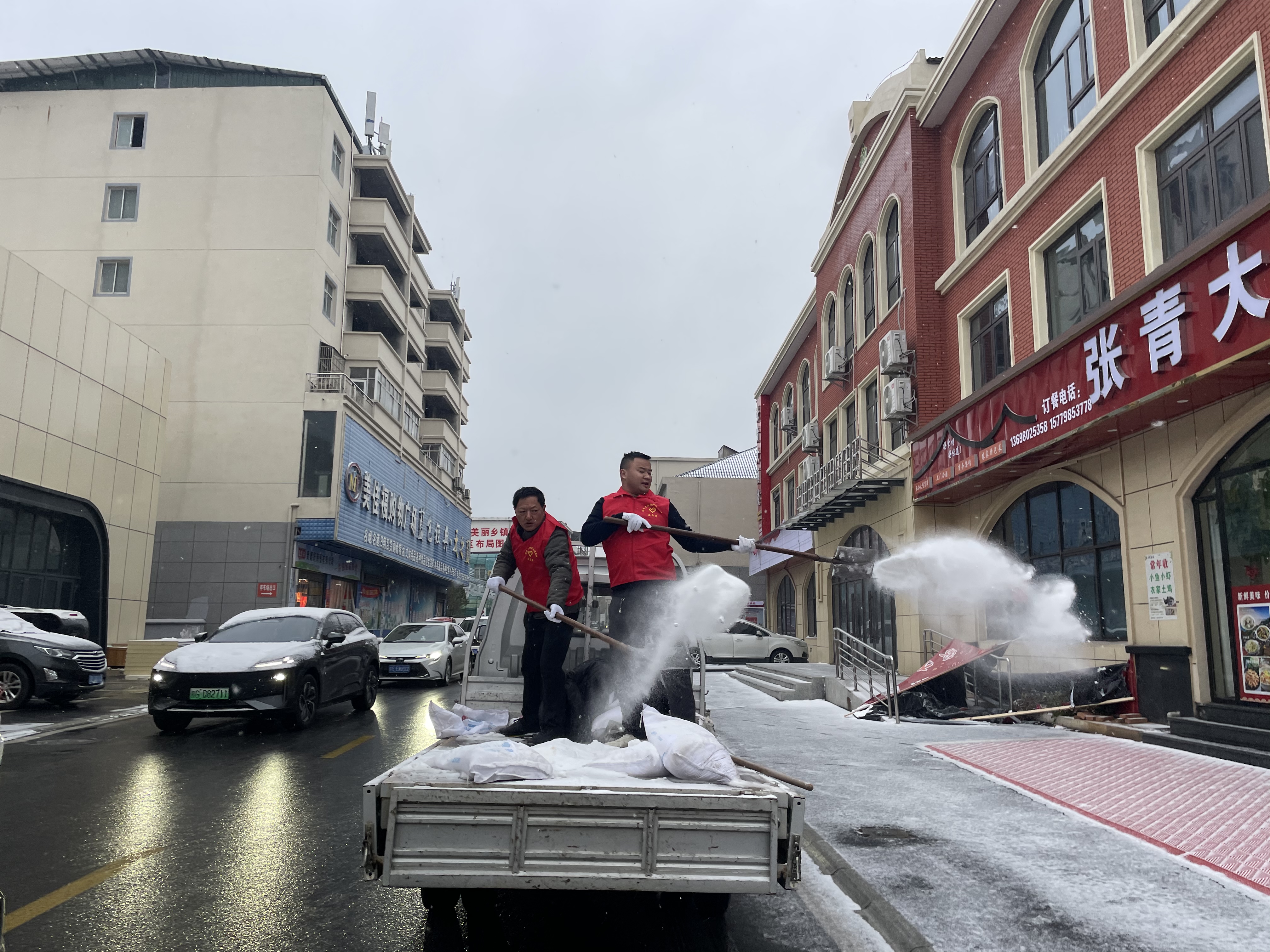 针对路面结冰隐患,该乡组织人员在辖区主干道、坡道、桥梁等重点路段及中小学、超市等人员密集场所提前撒盐除冰。志愿者不畏严寒,在易结冰区域撒工业盐,防范车辆打滑、行人摔倒。同时,通过广播、微信群发布道路结冰预警与出行提示,提醒群众防寒保暖、谨慎驾驶。