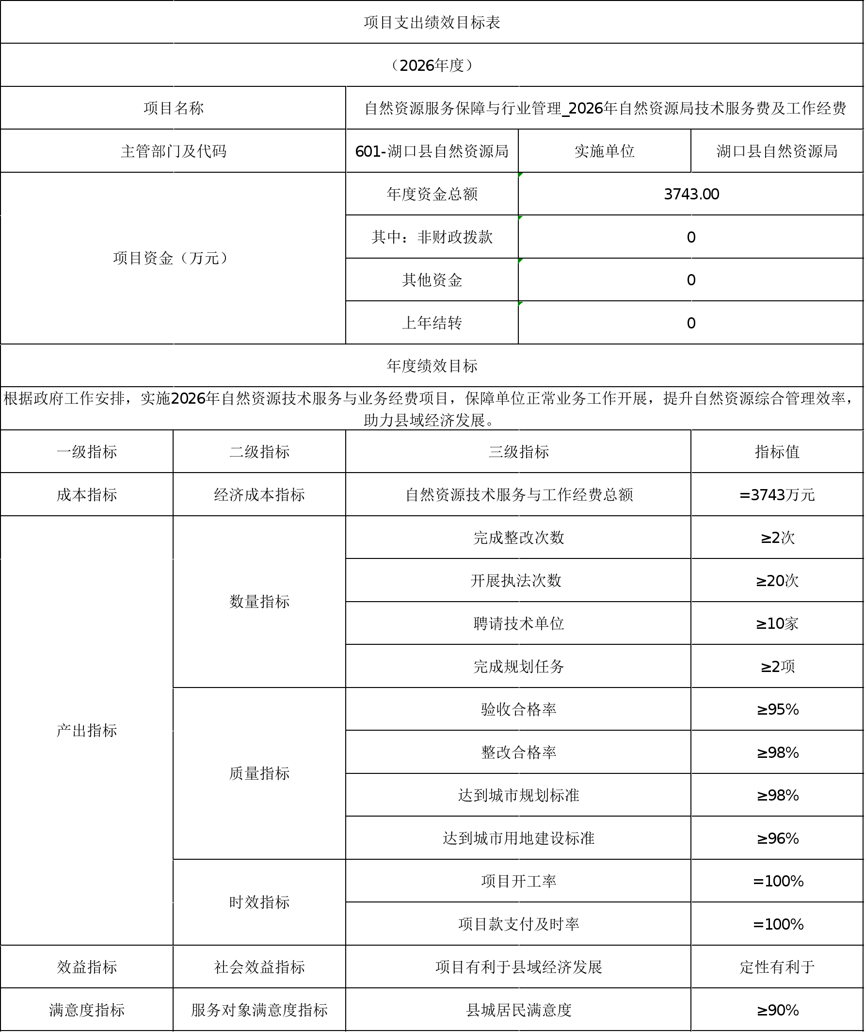 根据政府工作安排,我局2026年开展自然资源管理工作,实施2026年自然资源技术服务与业务经费项目,保障单位正常业务工作开展,提升自然资源综合管理效率,助力县域经济发展。