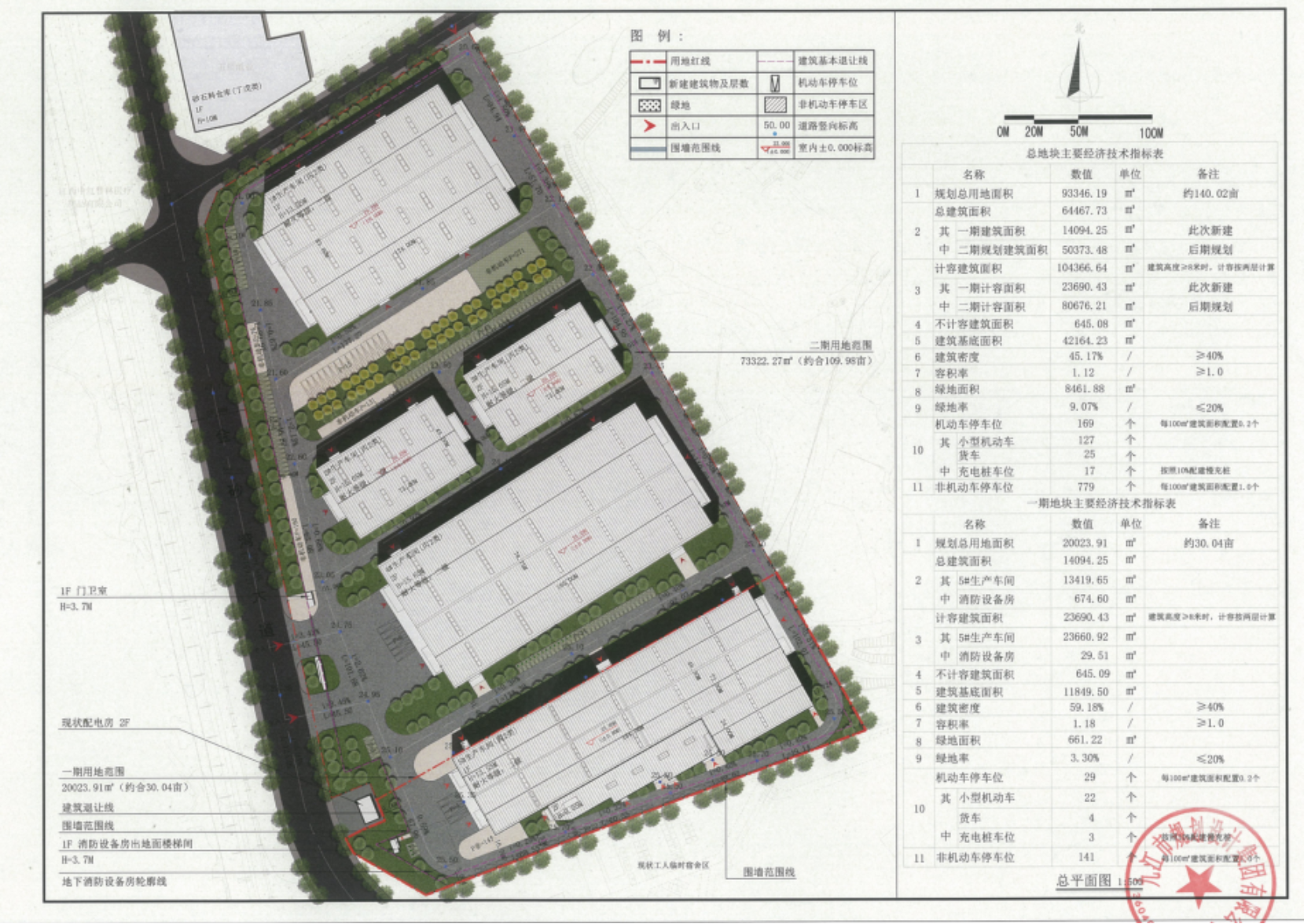具体内容:九江市湖口县固废综合处置中心及资源化利用示范项目位于湖口县高新技术产业园区金砂湾大道东侧五星纸业一期项目南侧,总用地面积93346.19㎡(合140.02亩),此次报建为该项目一期,一期用地面积为20023.91㎡,用地性质为100102(二类工业用地),该项目已取得江西省企业投资项目备案通知书,项目代码为:2502-360429-04-05-975571,一期用地范围内的容积率1.18,建筑密度59.18%,绿地率3.3%。一期总建筑面积14094.25㎡,总计容面积23690.43㎡,不计容面积645.09㎡。