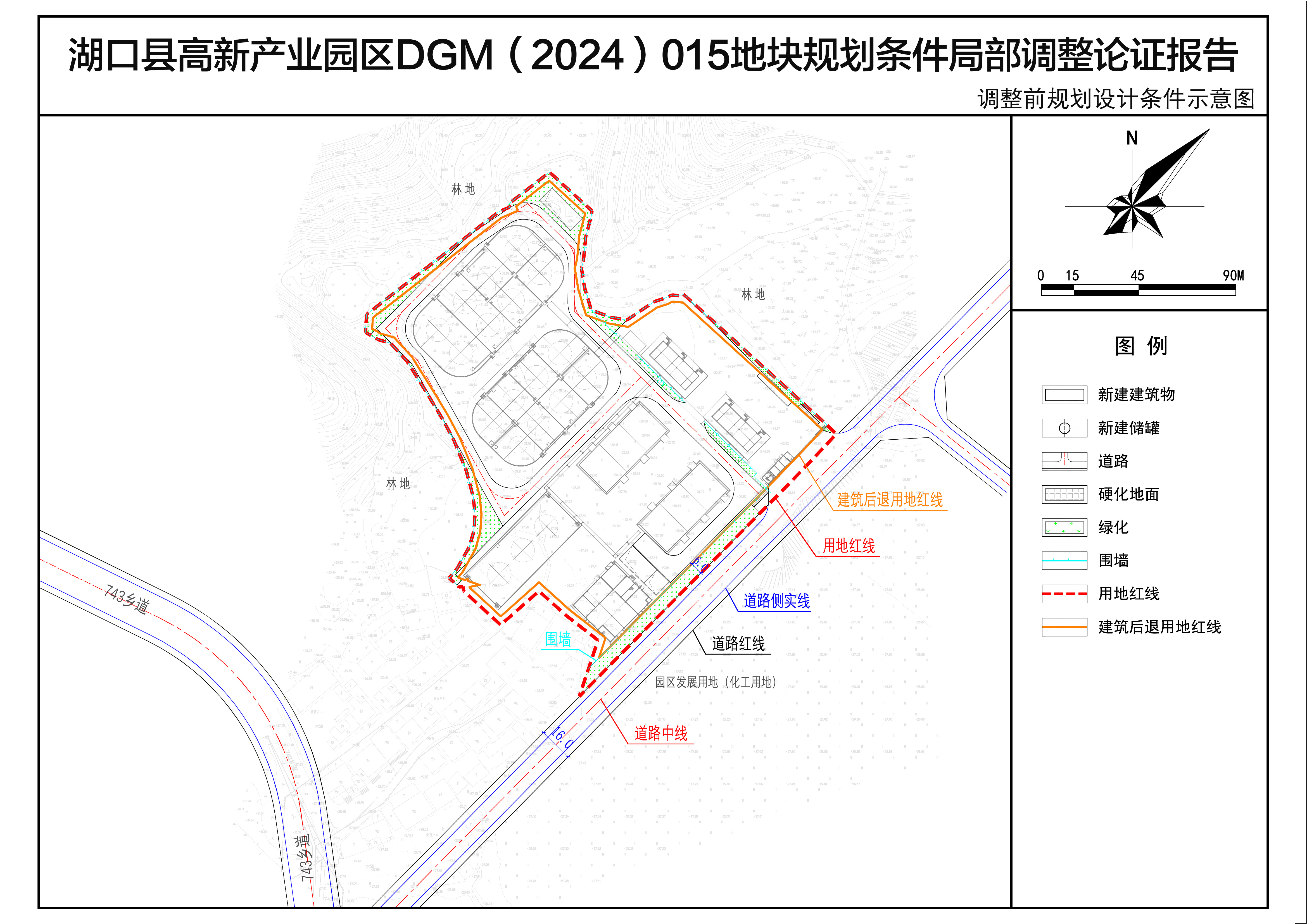 具体内容:江西贵拓化工有限公司危化品仓储运输一体化项目设计方案北侧为仓储区,南侧为公用工程楼等配套设施。项目建设工程设计方案中,公用工程楼位于3台1000m³柴油储罐南侧,且公用工程楼大门设计在北侧、正对3台柴油储罐。依专家安全评审意见,需将公用工程楼大门调整更改至南侧,考虑消防安全和危险品运输车辆进出,南侧围墙线如按照规划设计条件后退用地边界线距离≥6m进行退让,则无法满足安全通道需要。江西贵拓化工有限公司于2025年11月5日向我局提交规划条件变更申请,申请将该地块规划条件中“建筑后退用地边界距离南侧≥6m”变更为“建筑后退用地边界距离南侧≥3m”,其他指标及控制要求不变。详见附图及附件。