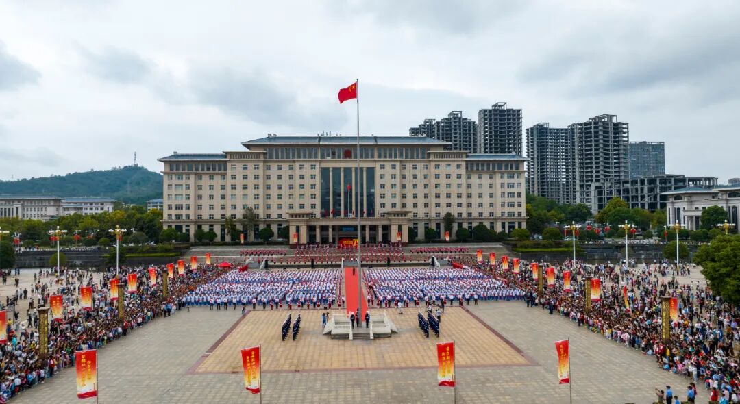 县委书记曾宝柱,县委副书记樊珈妤,县人大常委会主任史文,县政协主席梅媚等在家县四套班子领导,县委各部门、县直各单位和各乡镇党政主要负责同志,老同志代表、劳模代表、企业代表、师生代表、医护代表、政法队伍代表、群众代表、志愿者代表,各行政事业单位干部职工代表和社会各界群众万余人参加升国旗仪式。