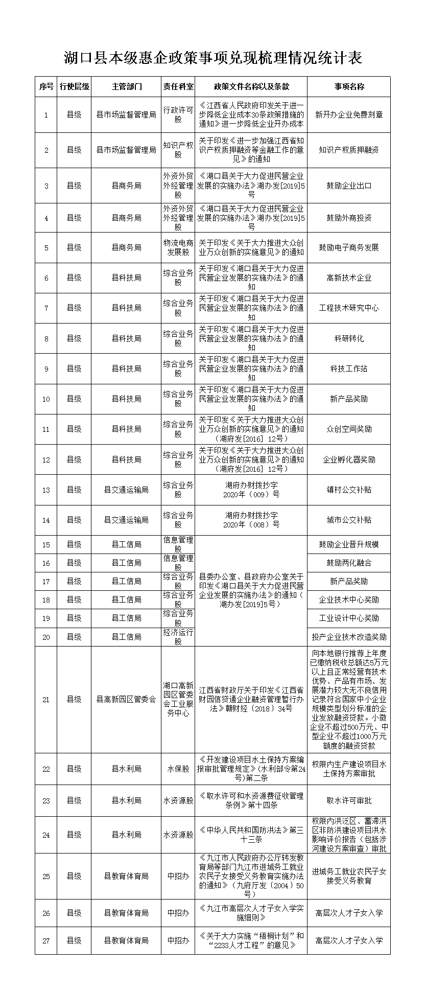 湖口县本级惠企政策事项兑现梳理情况统计表
