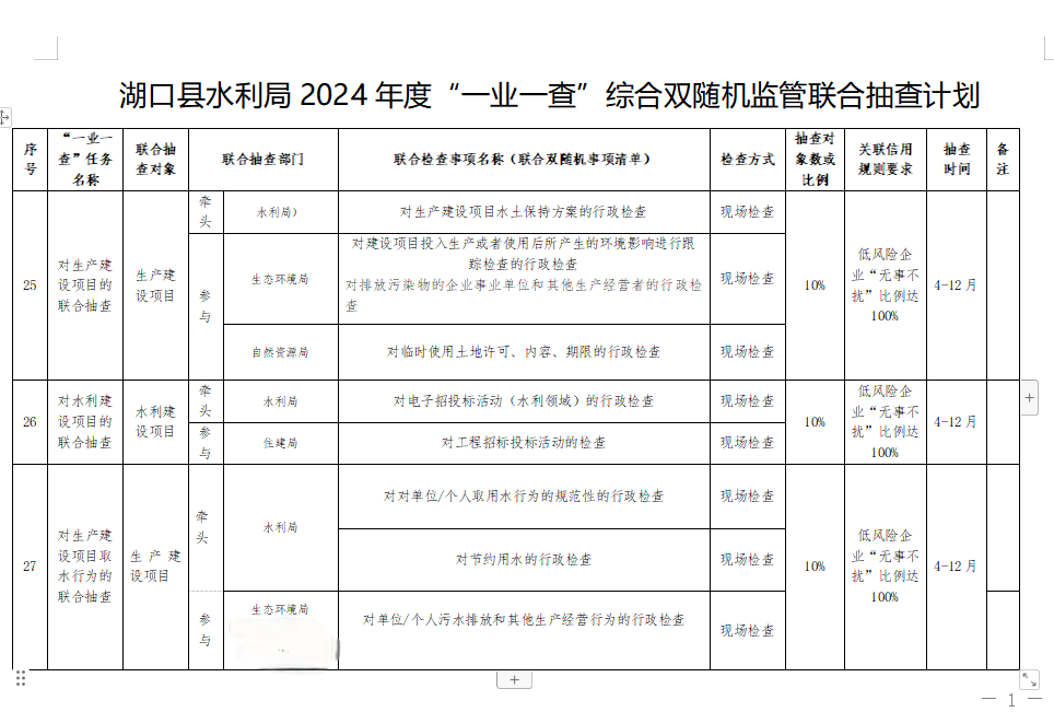 为进一步深化“放管服”改革,优化营商环境,湖口县水利局积极响应国家和省市场监管局的号召,全面开展2024年度“双随机、一公开”行政检查工作。此次检查旨在通过推进“一业一查”模式,实现从“按事项进行抽查”向“按行业实施联合抽查”的转变,以更加高效、精准的监管方式,为企业提供更加优质的政务服务。
