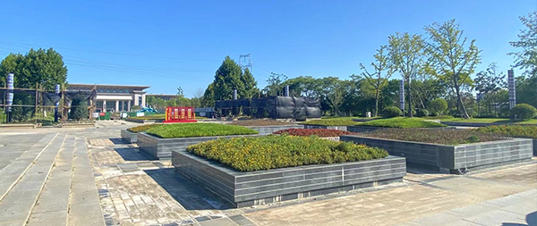目前东区绿化、亮化已完成;西区已完成土方平整,下一步进行苗木种植。