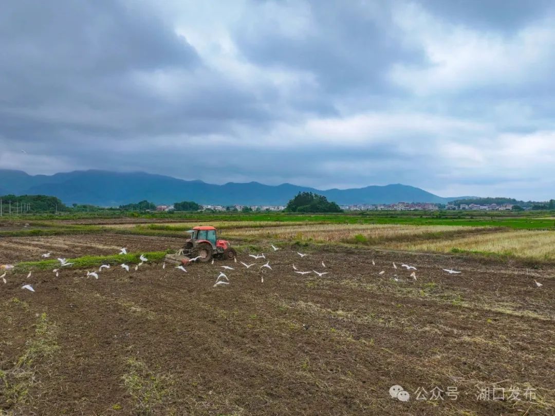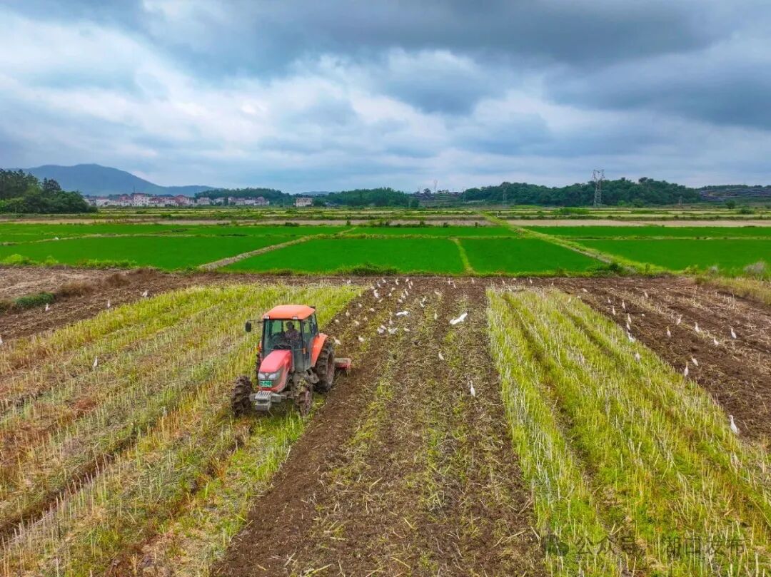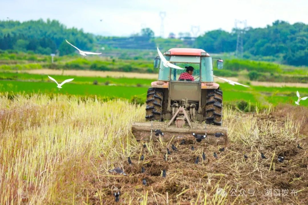 在她身后,成群的白鹭、八哥等鸟儿追逐着翻耕轨迹,争相啄食新翻出土的蚯蚓与害虫,机械的金属光泽与鸟群雪白的羽翼在阳光下交相辉映。远处的群山层峦叠翠,近处的村庄整洁美丽,构成“生态优美、机械欢歌”的现代农耕图景。“油菜收割后,及时翻耕,有利于秸秆还田腐熟,提升土壤中的有机质,促进中稻增收。”王青梅擦着汗介绍。