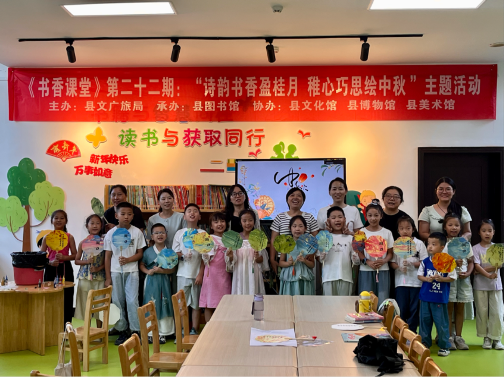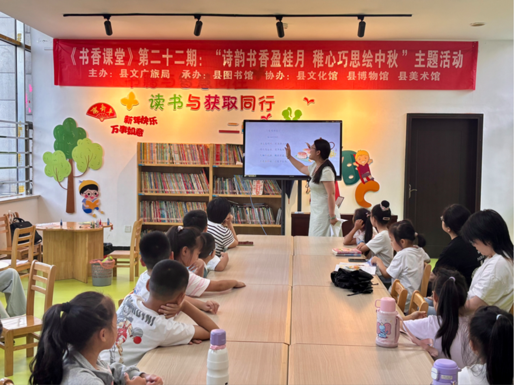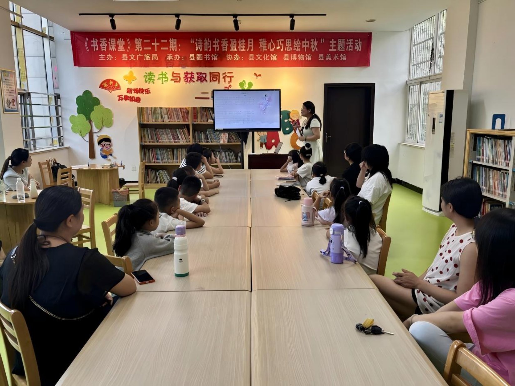 2025年10月5日下午,为弘扬中华优秀传统文化,营造浓厚的书香氛围,湖口县图书馆在一楼少儿活动中心成功开展了《书香课堂》第二十二期主题活动——“诗韵书香盈桂月 稚心巧思绘中秋”。本次活动由县文广旅局主办,县图书馆承办,县文化馆、县博物馆及县美术馆协办,吸引了众多亲子家庭参与,共同感受中秋文化的独特魅力。