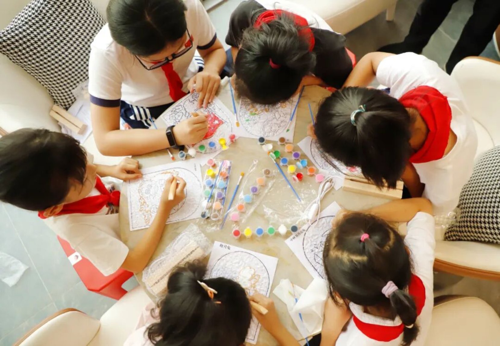 诵读结束后,活动进入充满趣味的手工创作环节。在老师的指导下,亲子家庭共同动手制作爱国与中秋主题玻璃画。孩子们发挥想象力,用画笔在玻璃上勾勒出五星红旗、天安门、玉兔、明月等图案,将对祖国的祝福与对团圆的期盼融入色彩斑斓的作品中。