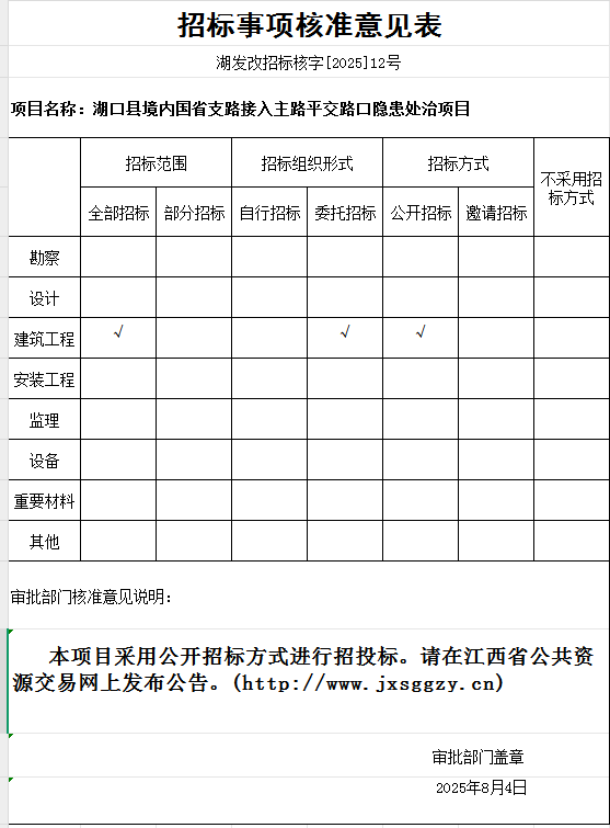 湖发改招标核字[2025]12号:湖口县境内国省支路接入主路平交路口隐患处治项目