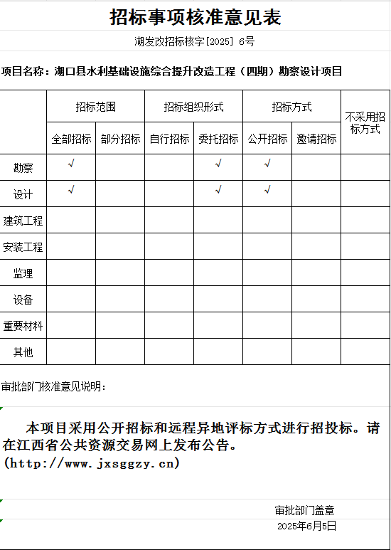 湖发改招标核字[2025]6号:湖口县水利基础设施综合提升改造工程(四期)勘察设计项目