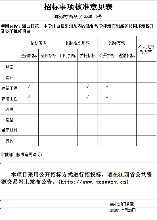 湖发改招标核字[2025]10号:关于湖口县第二中学体育俱乐部加固改造和教学楼墙面出新等校园环境提升及零星维修项目招标核准的批复